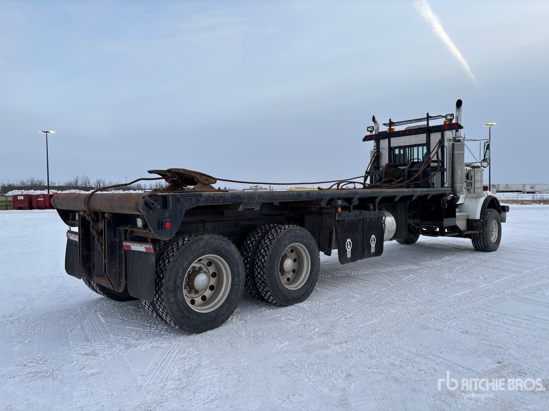 Cat 3406 6 Cylinder 14.6 L Diesel 430 hp Engine, 1994 US EPA Label, Positive Air Shutoff, Engine Brake, Eaton Fuller RTO-16908LL 8LL Manual Transmission, 4-Speed Auxiliary Transmission, 20000 lb Front Axle, 50000 lb Rears, Meritor RT-52-180 Drive Axles, 5.38:1 Axle Ratio, 70000 lb GVWR, Aluminum Wheels, 445/65R22.5 Front Tires, 11R24.5 Rear Tires, Dual Steering Boxes, Double Frame, Air Assist Front Suspension, Spring Suspension, 330 in Wheelbase, 22 ft x 102 in Bed, Tail Roll, 20 ft Double Frame Gin Poles, Braden 5215S Winch, Tulsa Winch, Flip-Over 5th-Wheel