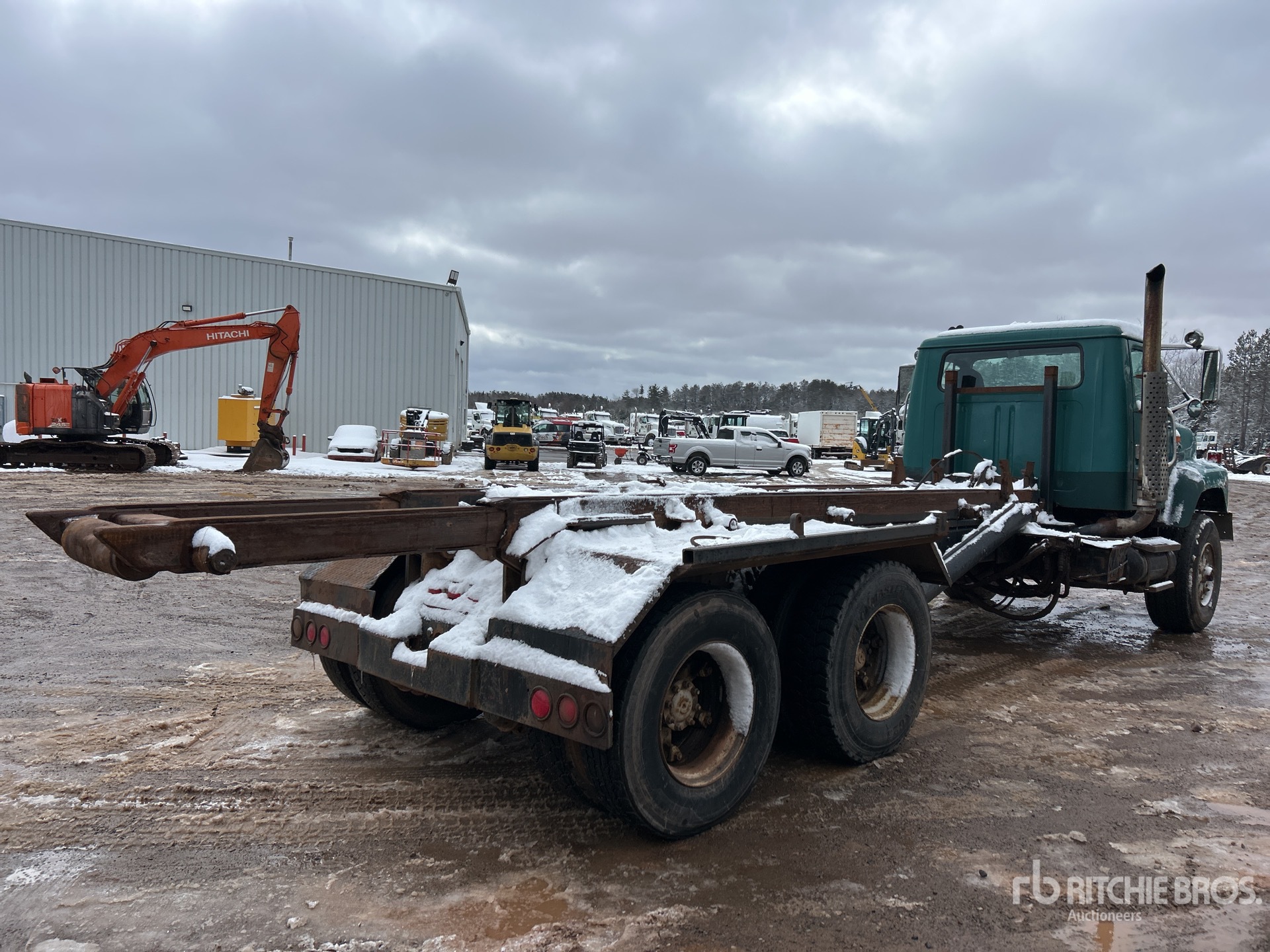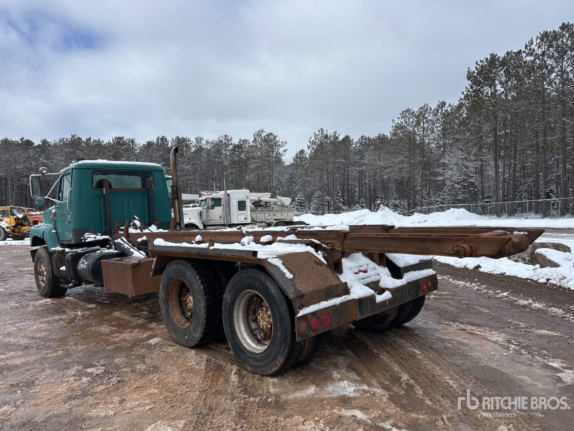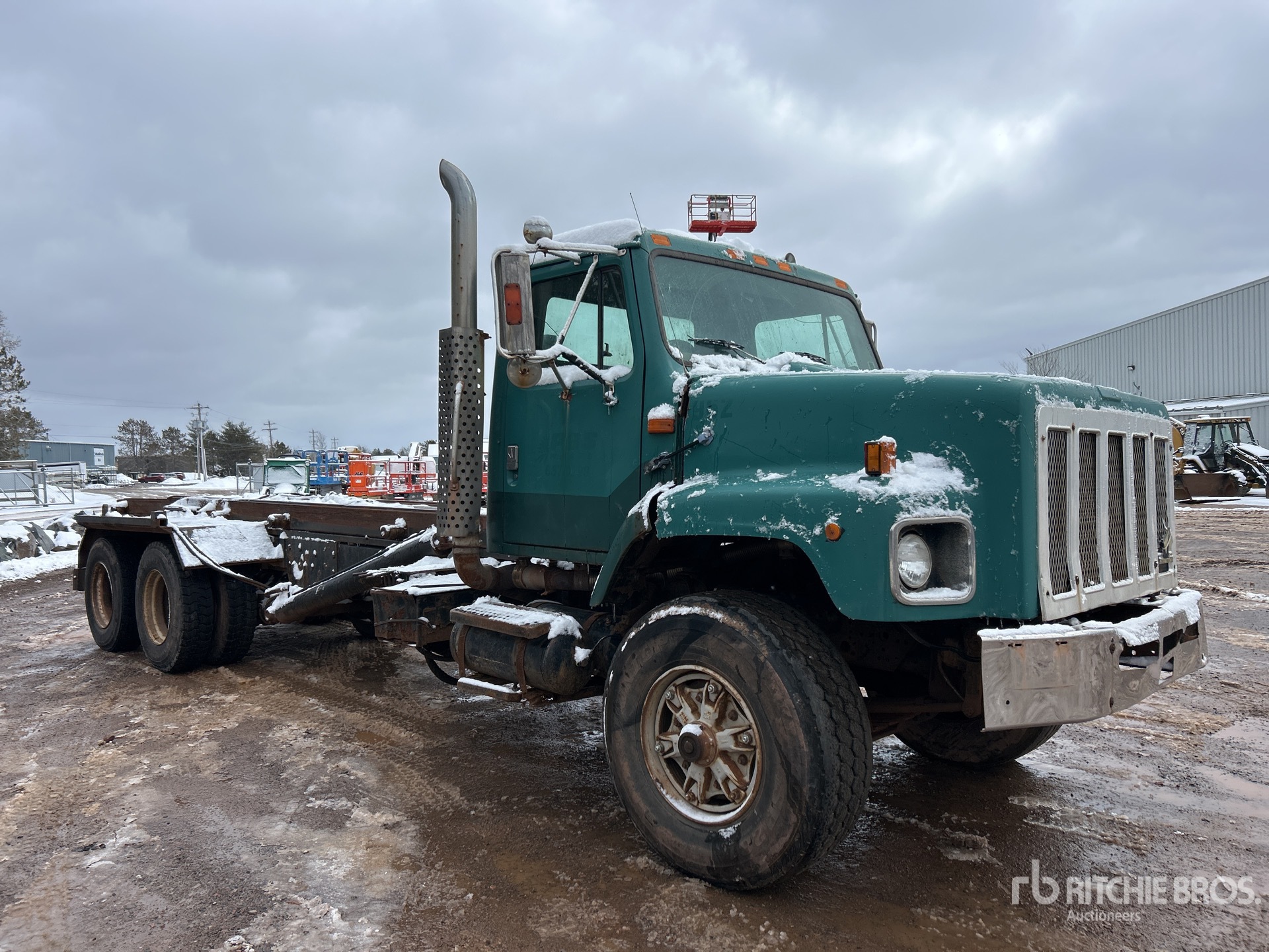 International 6 Cylinder Diesel Engine, 16181 Engine hrs, Eaton Fuller 8LL Manual Transmission, Differential Lock, 425/65R22.5 Front Tires, 11R22.5 Rear Tires, Dual Steering Boxes, Double Frame, Spring over Walking Beam Suspension, 248 in Wheelbase, PTO, 20 ft Hoist