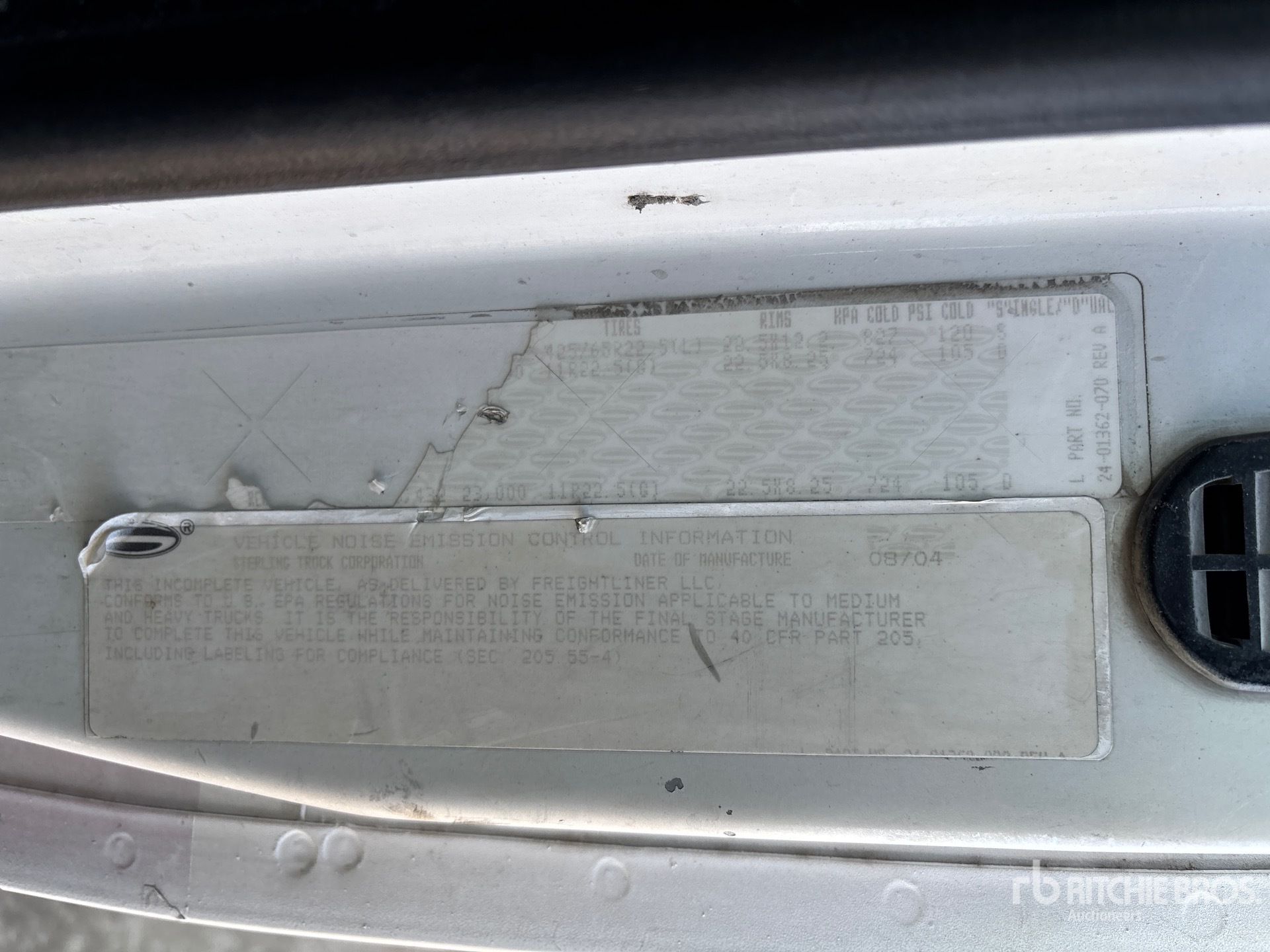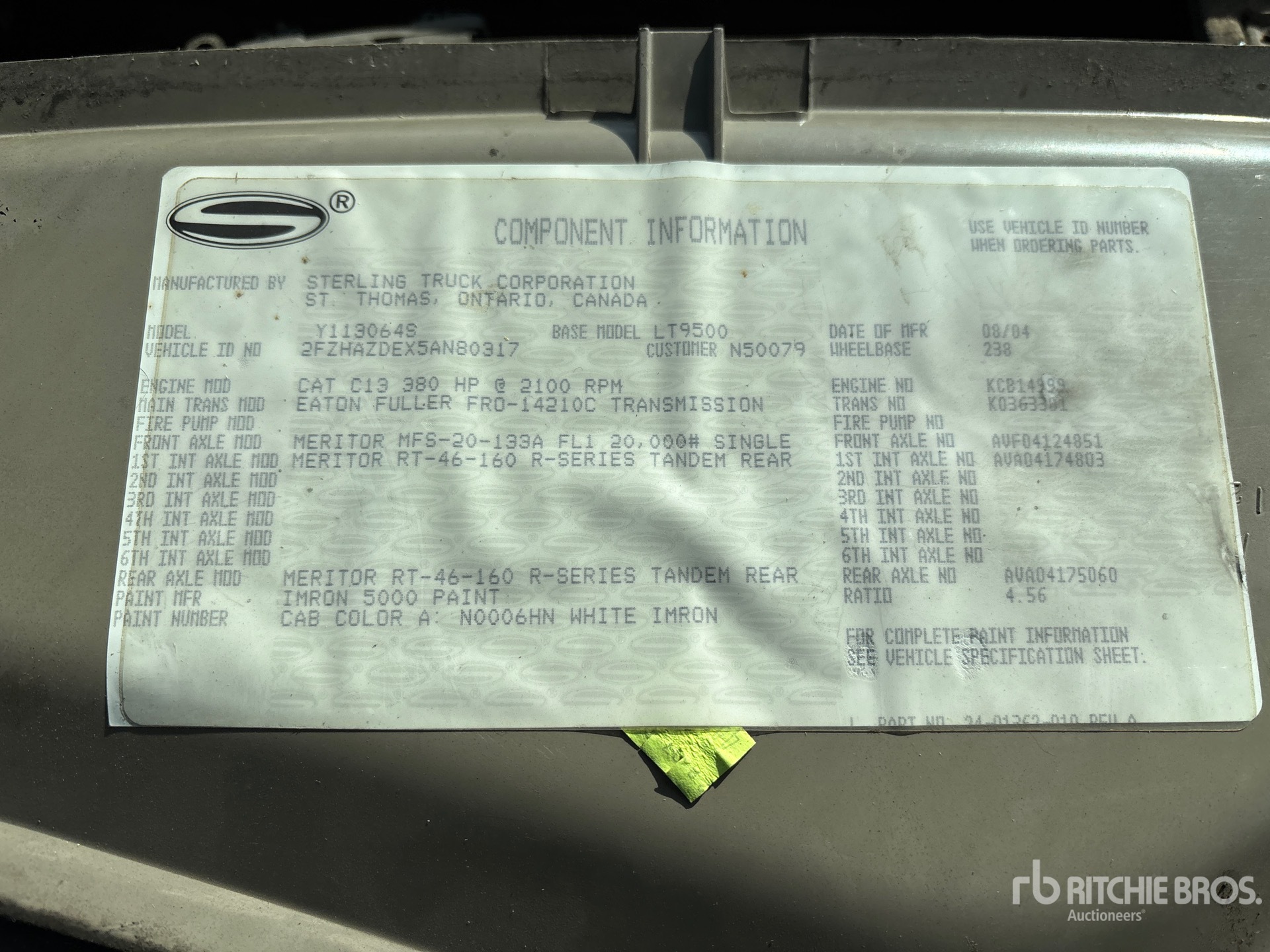 Cat C13 6 Cylinder 12.5 L Diesel 380 hp Engine, 2004 US EPA Label, CARB Compliant, Positive Air Shutoff, Eaton Fuller FRO-14210C 10-Speed Manual Transmission, 20000 lb Front Axle, 46000 lb Rears, Meritor RT-46-160 Drive Axles, 4.56:1 Axle Ratio, 66000 lb GVWR, Air Ride Cab, 425/65R22.5 Front Tires, 11R22.5 Rear Tires, Dual Steering Boxes, Double Frame, Spring over Walking Beam Suspension, 238 in Wheelbase, PTO, Steel Debris Tank, Hoist, Vibrator, Full Open Tailgate, Hydraulic Tailgate Locks, Fraserwoods SIAV 8702 Blower
