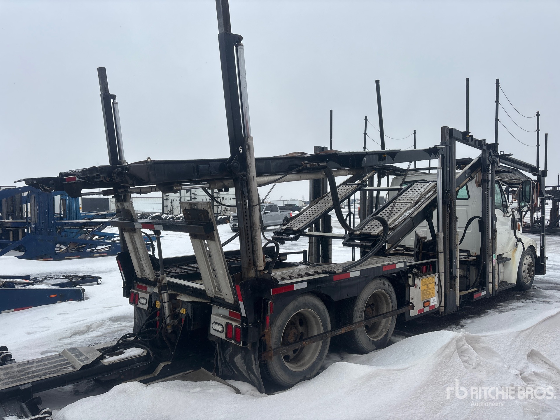 Mercedes-Benz 6 Cylinder Diesel Engine, Engine Brake, Eaton Fuller FAO-16810C 10-Speed Manual Transmission, Differential Lock, 13200 lb Front Axle, 40000 lb Rears, 3.21:1 Axle Ratio, Aluminum Wheels, 295/60R22.5 Front Tires, 255/70R22.5 Rear Tires, Air Ride Suspension, 237 in Wheelbase, PTO, 3 Vehicle Capacity, Hydraulic Lift, Soft Tie Downs