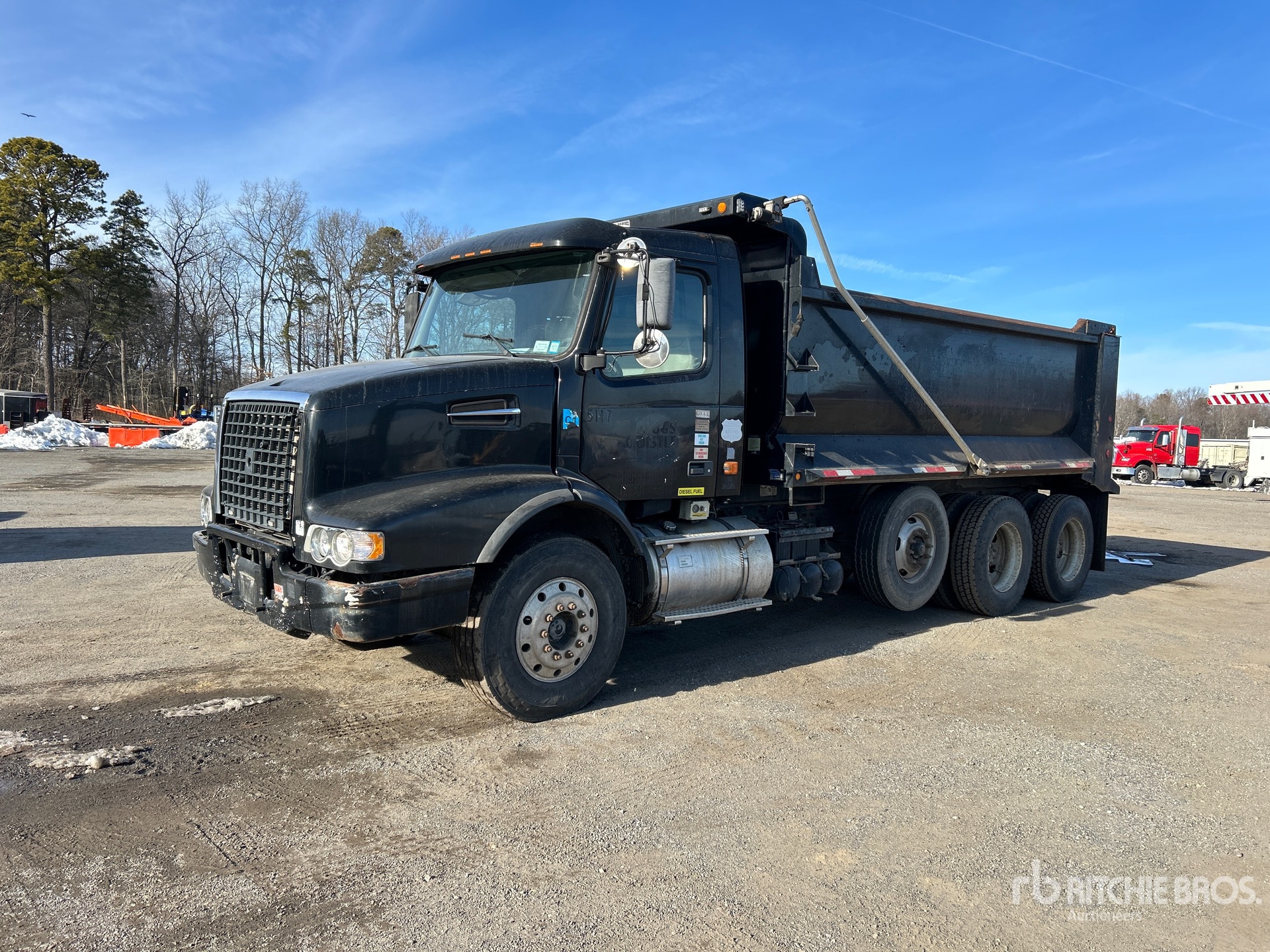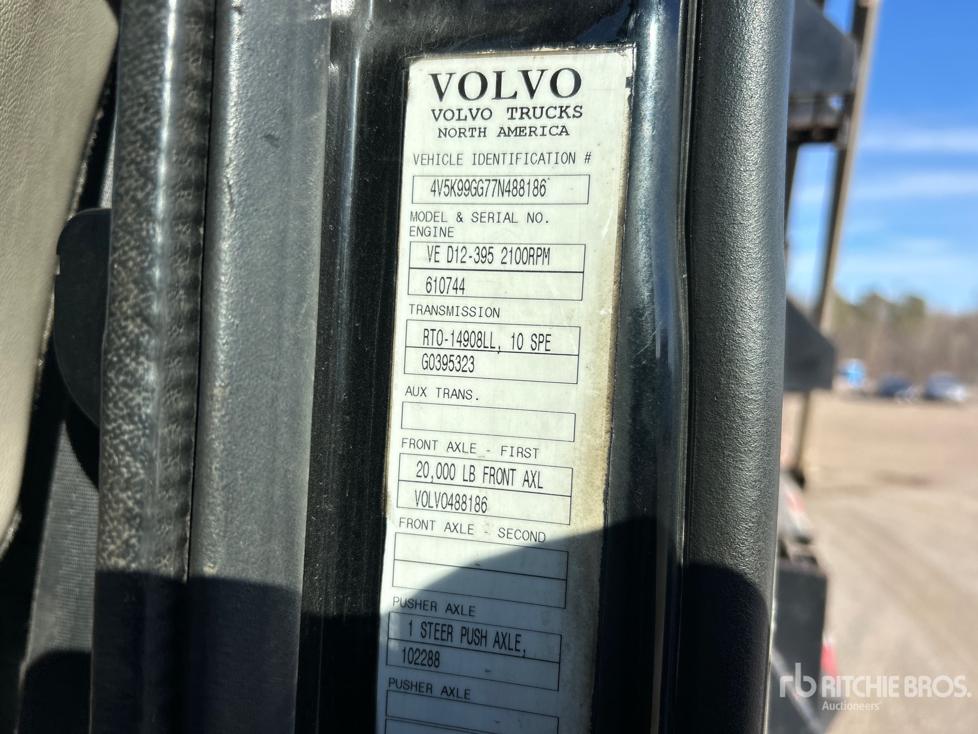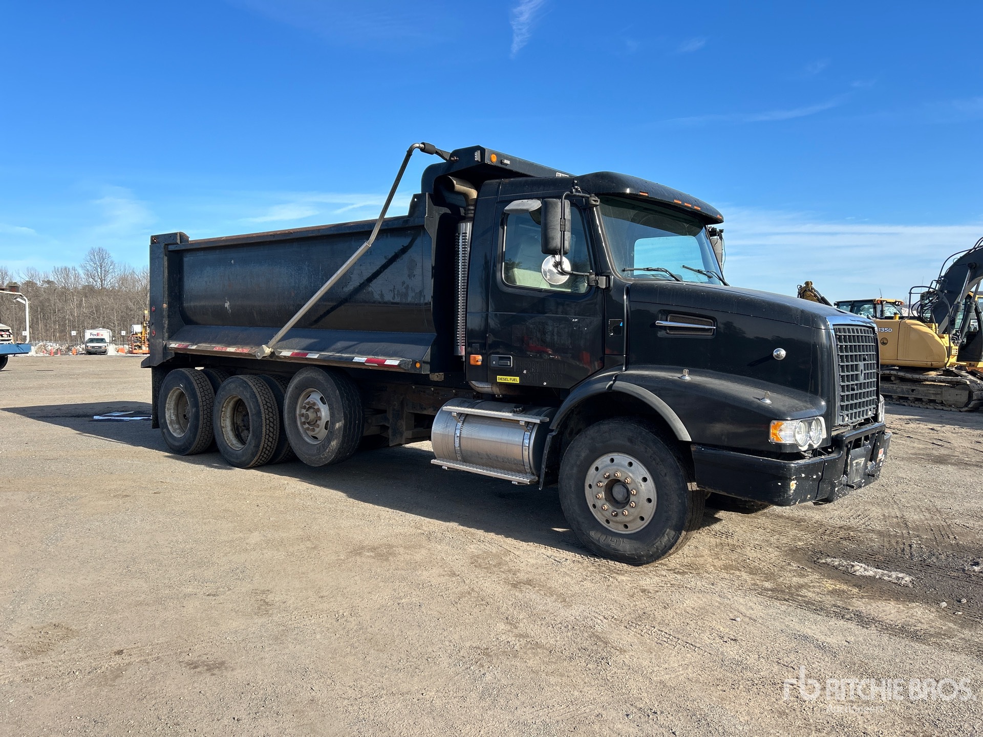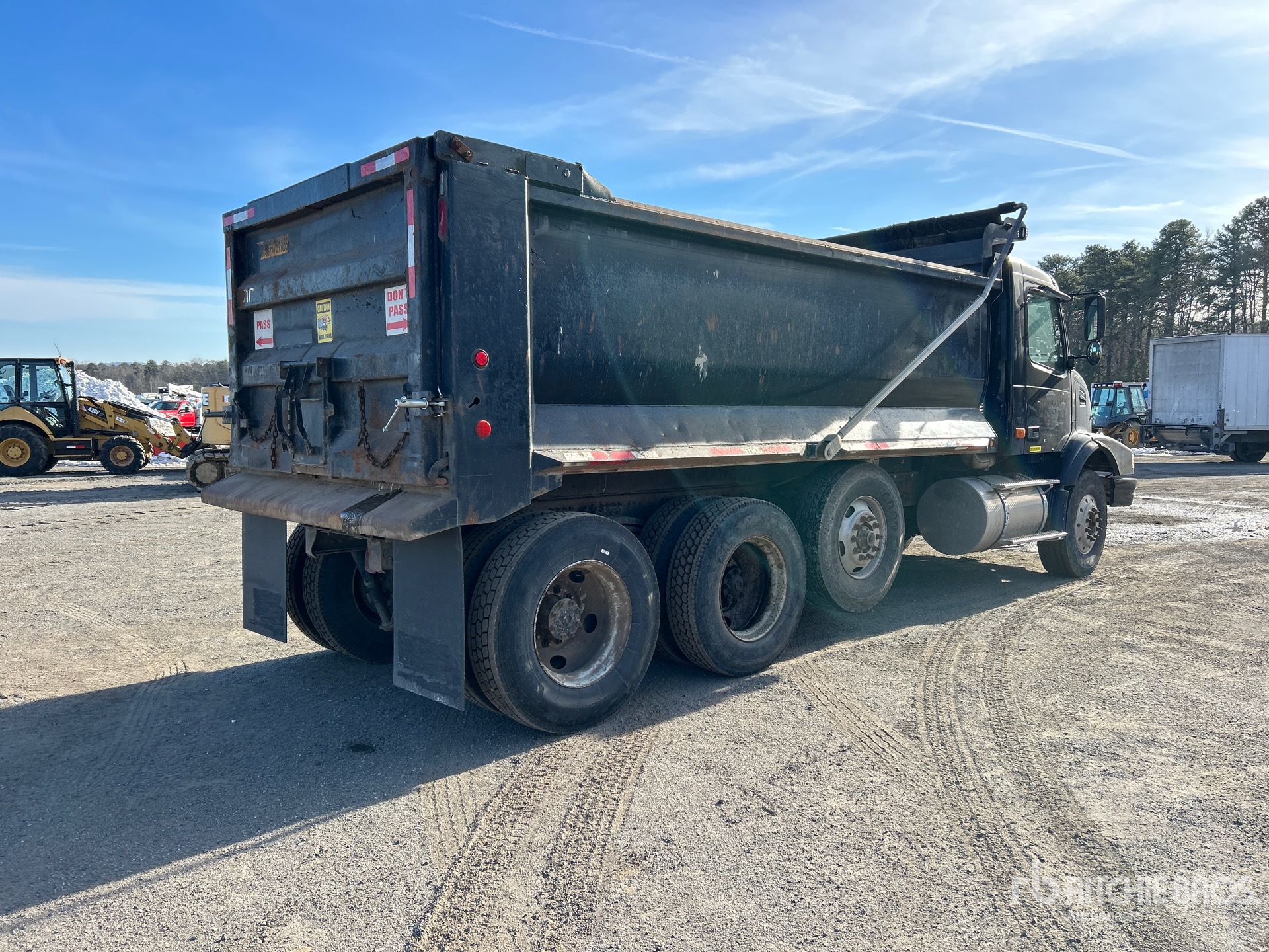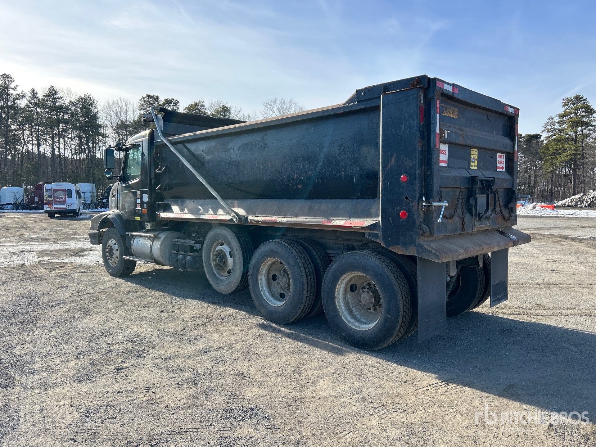 Volvo D12-395 6 Cylinder Diesel Engine, 2006 US EPA Label, 1120 Engine hrs, Eaton Fuller RTO-14908LL Manual Transmission, 18800 lb Front Axle, 64010 lb Rears, 53500 lb GVWR, Aluminum Wheels, 315/80R22.5, Spring Suspension, 229 in Wheelbase, OX Bodies 17 ft Long x 4 ft High Steel Body, Round Bottom, Electric Roll Tarp, Tailgate Chute