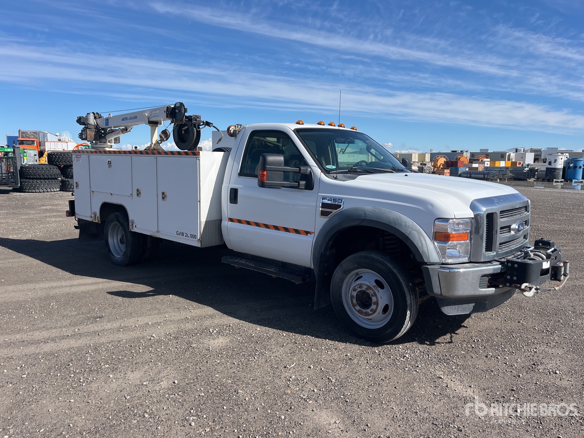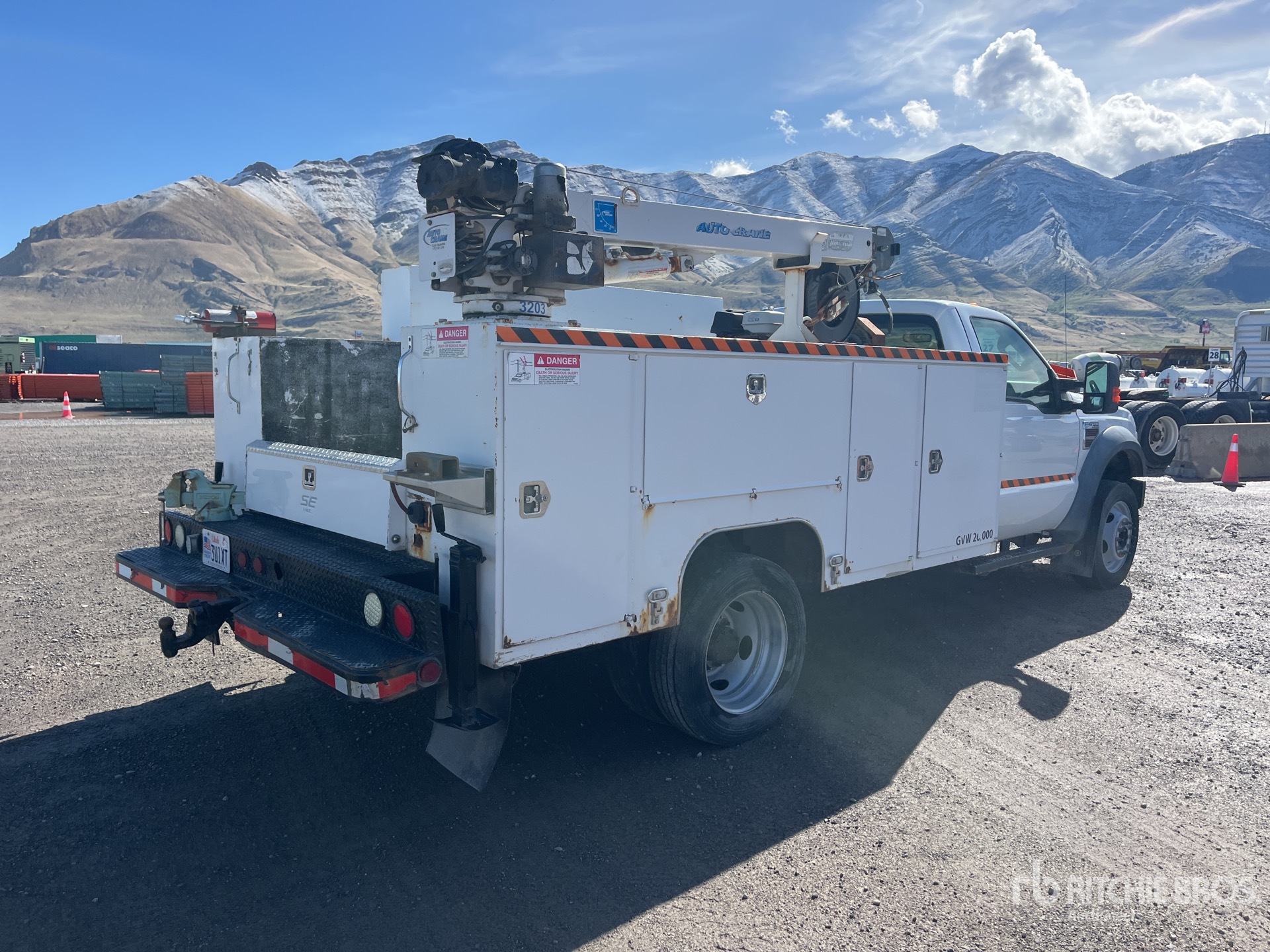 Ford V8 Diesel Engine, 2008 US EPA Label, Automatic Transmission, 7000 lb Front Axle, 12000 lb Rears, 16500 lb GVWR, 225/70R19.5, Spring Suspension, 165 in Wheelbase, PTO, SE INC SBD-132-95 11 ft Body, Manual Stabilizers, Auto Crane 3203 2 Section Hydraulic Crane, Baldor DH3E 3000 W Diesel Generator Set, Gasoline Air Compressor, Air Hose Reel