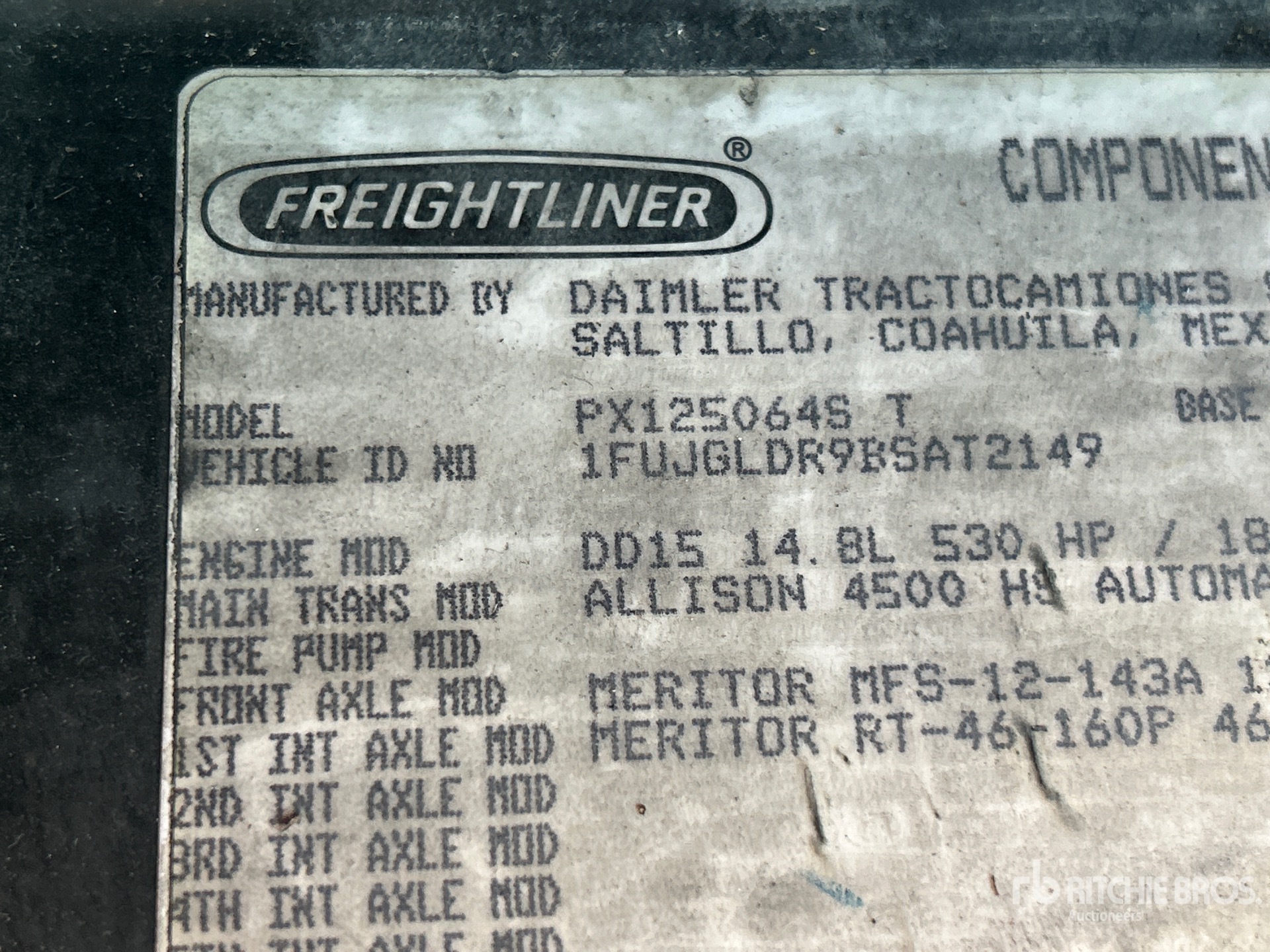 자세한 장비 정보는 범위가 제한되어 있으며, Ritchie Bros. Auctioneers에서는 본 문서에 명시된 항목 이외의 장비 구성요소나 측면에 대해서는 검사하지 않았습니다. 명시적으로 언급하지 않는 한, 당사는 장비 또는 그 구성요소와 관련하여 명시적으로나 묵시적으로 어떠한 진술이나 보증을 제공하지 않습니다. 여기에는 기능, 해당 당국이나 규제 기관의 안전 표준 또는 요구 사항의 준수, 특정 용도 적합성, 상업성 등과 관련된 진술 또는 보증을 포함하되 이에 국한되지 않습니다. 입찰하기 전 장비의 상세한 검사를 실시하도록 강력히 권장합니다.