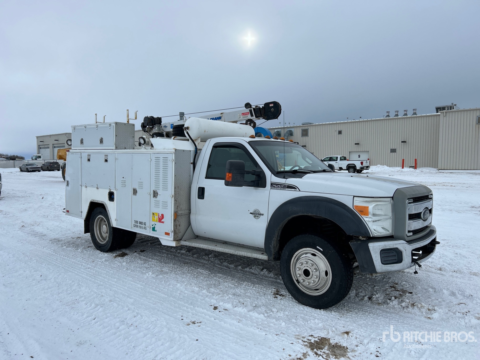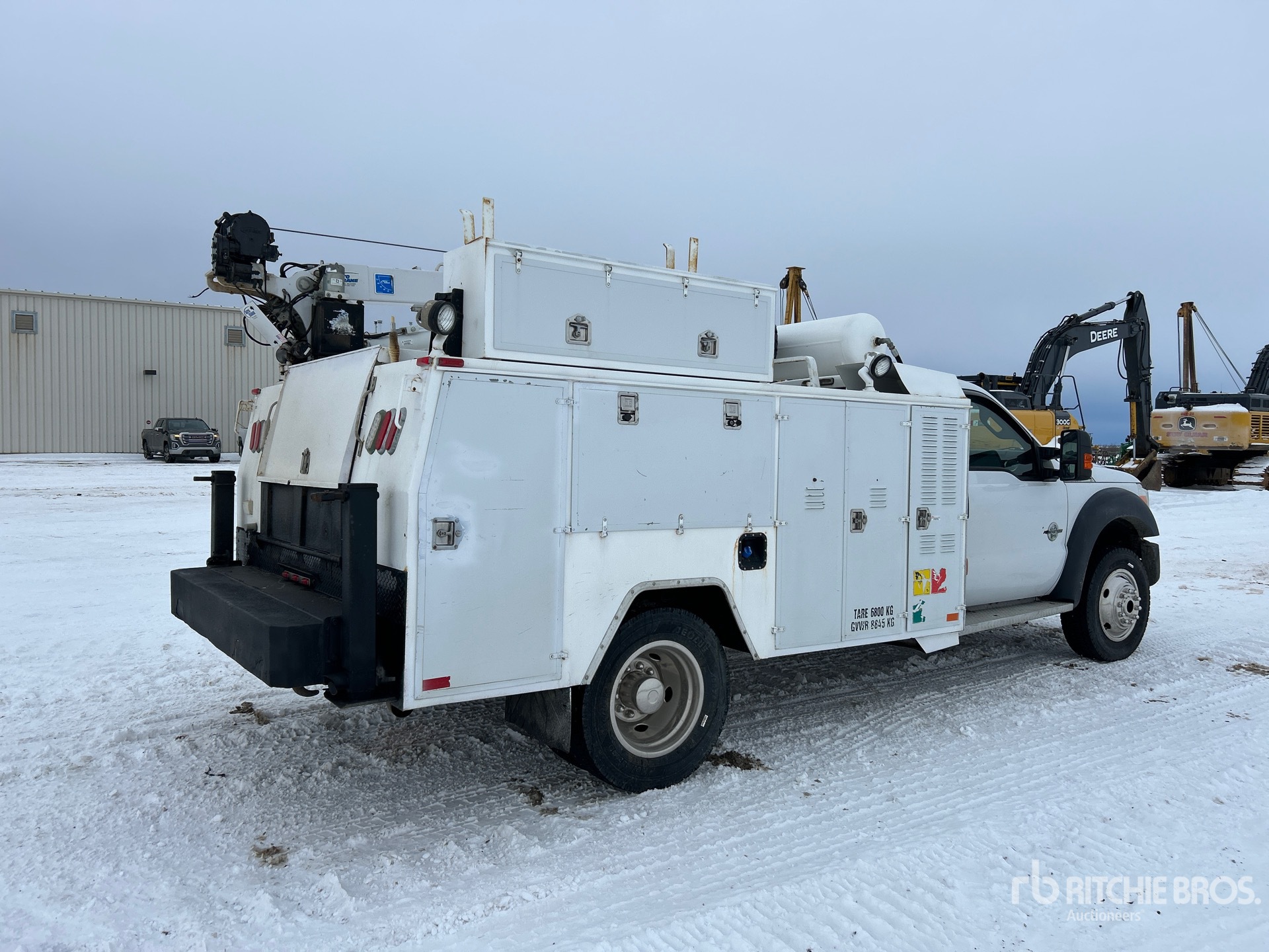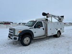 Power stroke V8 6.7 L Diesel 300 hp Engine, 2013 US EPA Label, CARB Compliant, Engine Coolant Heater, Positive Air Shutoff, 19825 Engine hrs, Automatic Transmission, 7000 lb Front Axle, 14706 lb Rears, 19500 lb GVWR, 245/70R19.5 Front Tires, 245/70R19.5 Rear Tires, Spring Suspension, 165 in Wheelbase, 2013 Truckbody Canada SB3827 11 ft Body, Manual Stabilizers, Auto Crane 5005EH 2 Section Crane, VMAC Air Compressor