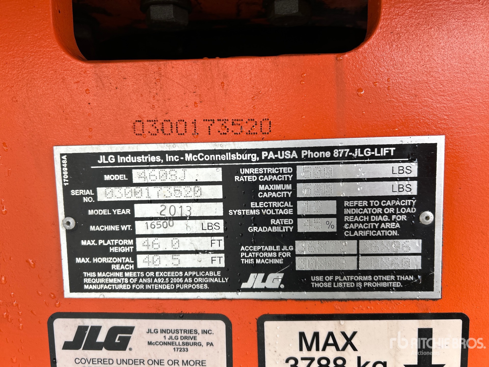46 ft Max Platform Height, 500 lb Max Weight Capacity, Jib, Power to Platform, 2011 US EPA Label, Deutz D2011L03 3 Cylinder 49 hp 2.33 L Diesel Engine, 12-16.5NH Tires