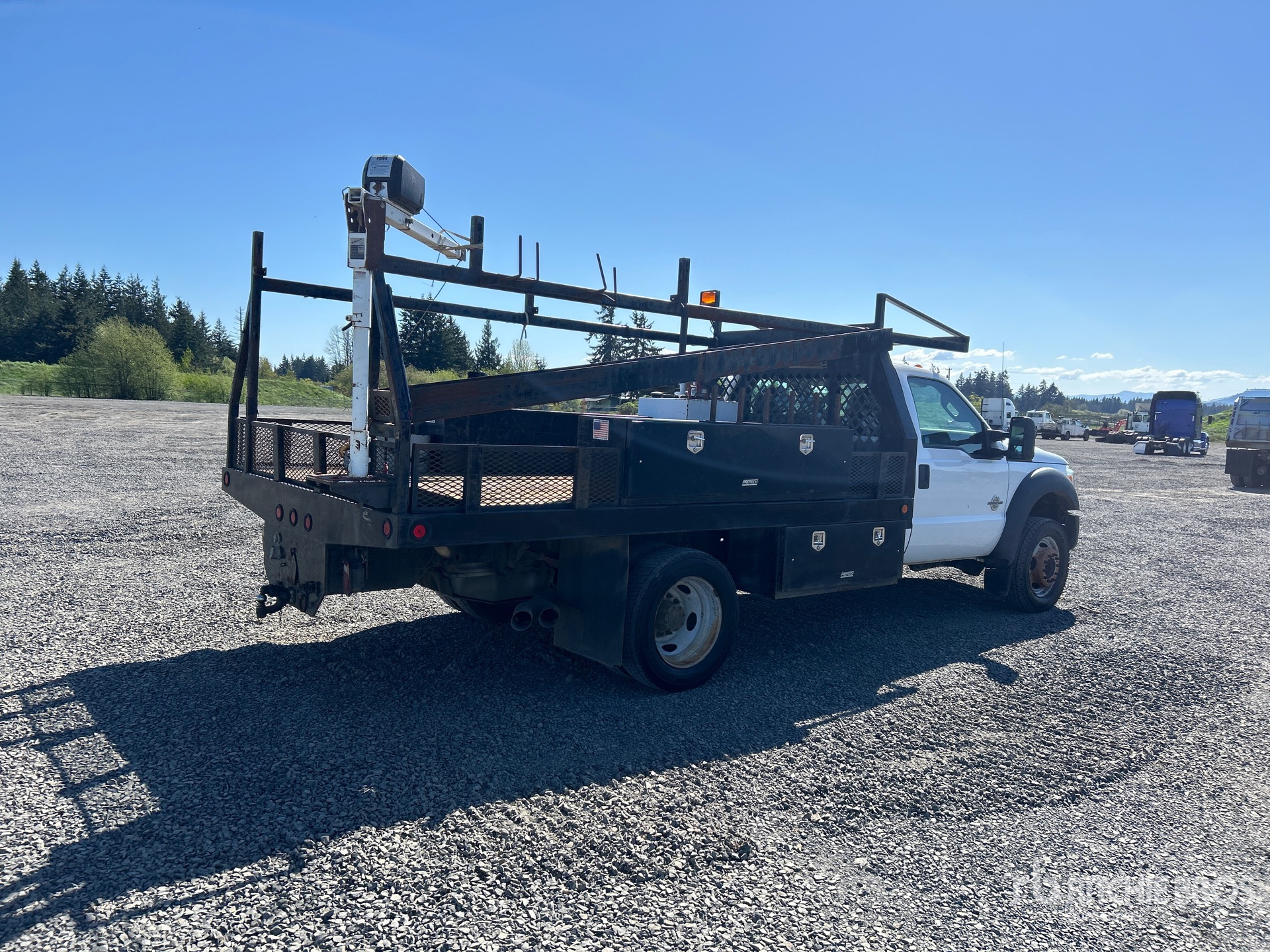 Located in Lane 17 Spot 18, Ford Powerstroke V8 6.7 cid Diesel 300 hp Engine, 2015 US EPA Label, Requires Diesel Exhaust Fluid, 4663 Engine hrs, Automatic Transmission, 6000 lb Front Axle, 12000 lb Rears, 16500 lb GVWR, 225/70R19.5, Spring Suspension, 165 in Wheelbase, Western Mule P10-DC 1000 lb 2 Section Electric Crane, 12 ft 4 in x 95.5 in Bed, 50 Fuel Tank /w Pump, Pintle Hitch