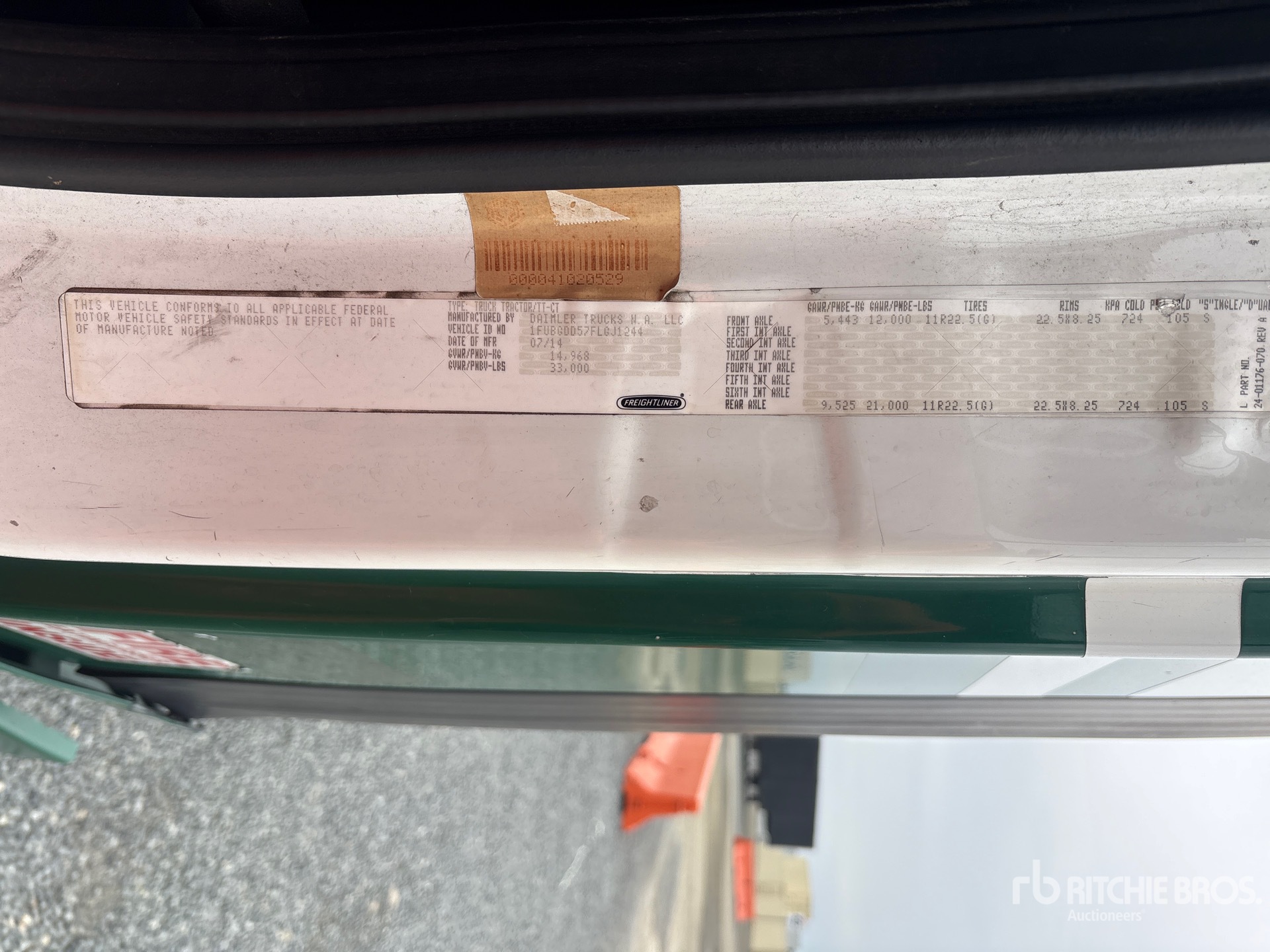 Detroit DD15 455 hp Engine, 2014 US EPA Label, 19210 Engine hrs, Eaton Fuller FRO-15210C 10-Speed Manual Transmission, 12000 lb Front Axle, 21000 lb Rears, 33000 lb GVWR, Engine Brake, 158 in Wheelbase, Air Suspension, 11R22.5, Dual Fuel Tanks