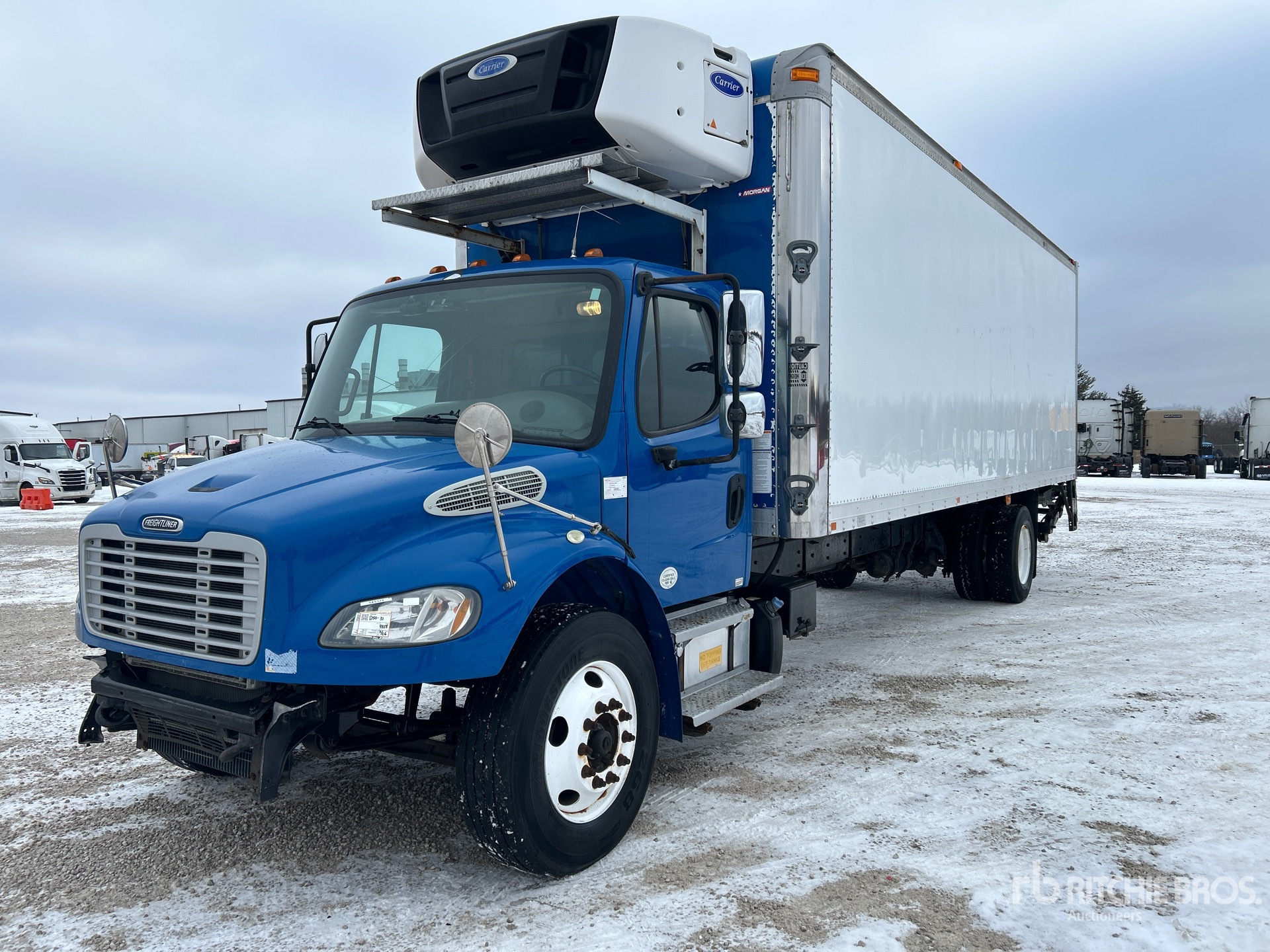 Located in Lane 12 Spot 5, Cummins ISB 6 Cylinder 6.7 L Diesel 280 hp Engine, 2014 US EPA Label, 9518 Engine hrs, Engine Brake, Allison 2500 Automatic Transmission, 12000 lb Front Axle, 21000 lb Rears, Detroit DA-RS-21.0-4 Drive Axles, 5.88:1 Axle Ratio, 33000 lb GVWR, Aluminum Wheels, 295/75R22.5 Front Tires, 295/75R22.5 Rear Tires, Air Ride Suspension, 285 in Wheelbase, Carrier Supra 960 Reefer Unit, Morgan 26 ft x 102 in Wide x 93 in High Body, Ducted Floor, Walk-Up Ramp, Liftgate