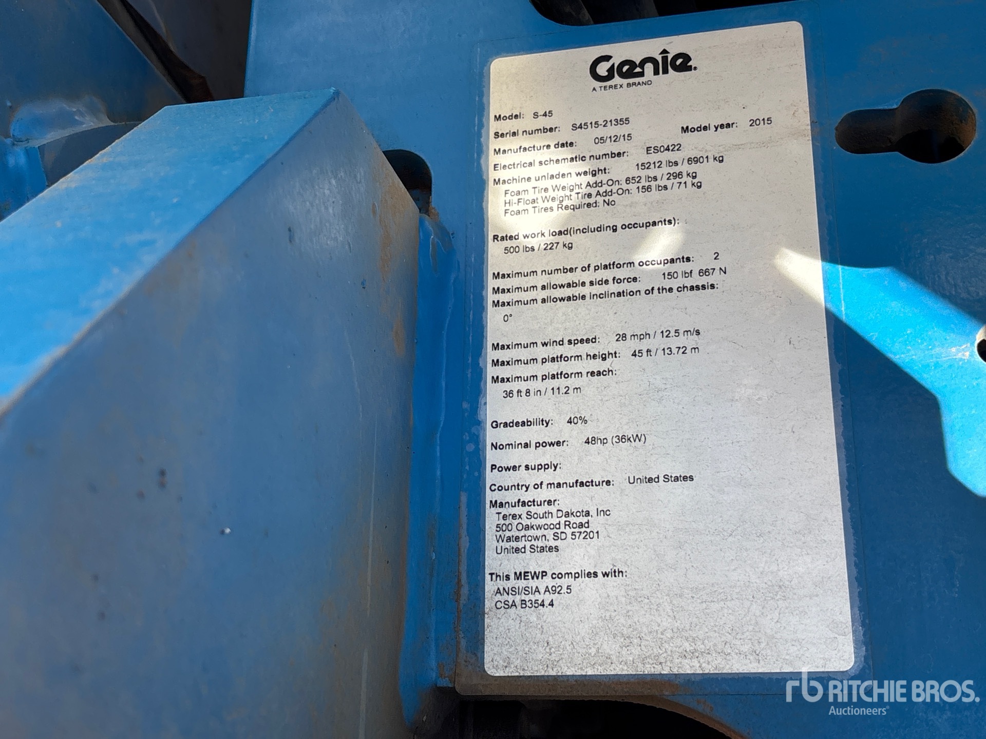 45 ft Max Platform Height, 500 lb Max Weight Capacity, Jib, Power to Platform, Onboard Generator, 2015 US EPA Label, Deutz D2.9 L4 4 Cylinder 49 hp 2.9 L Diesel Engine, 12-16.5 Foam-Filled Tires