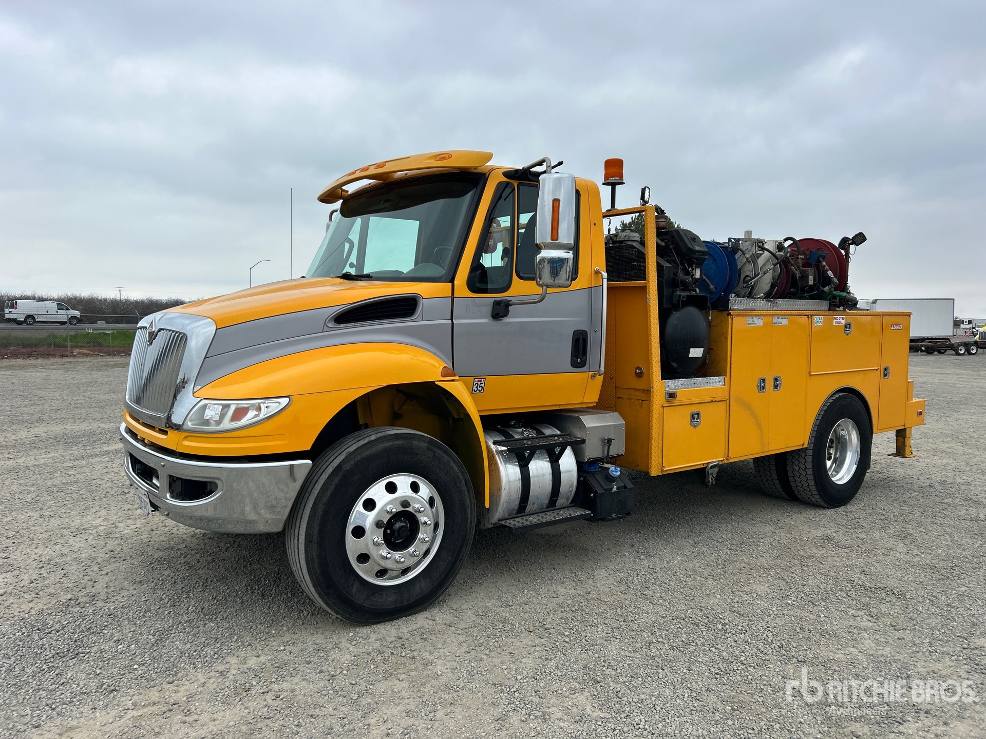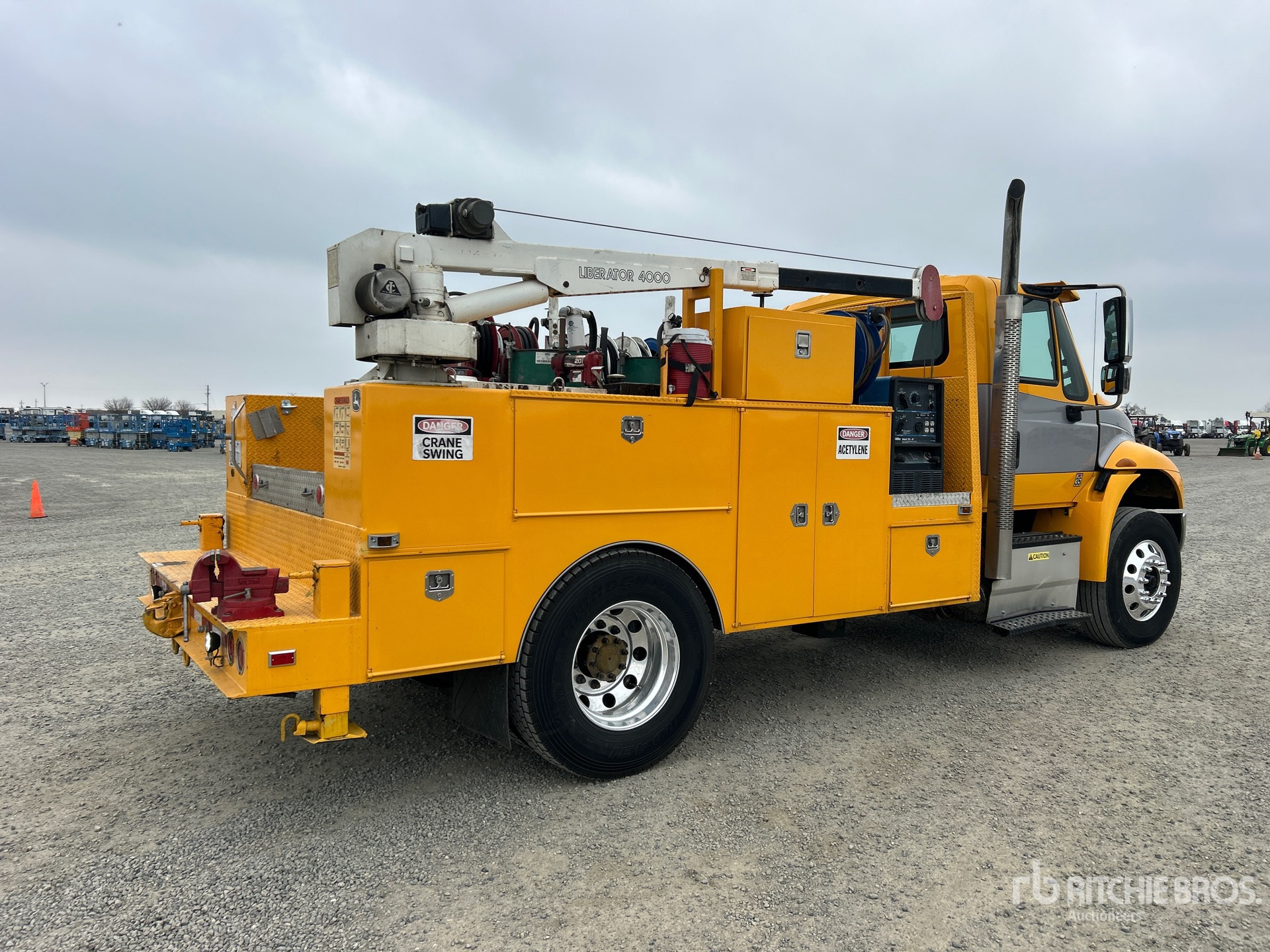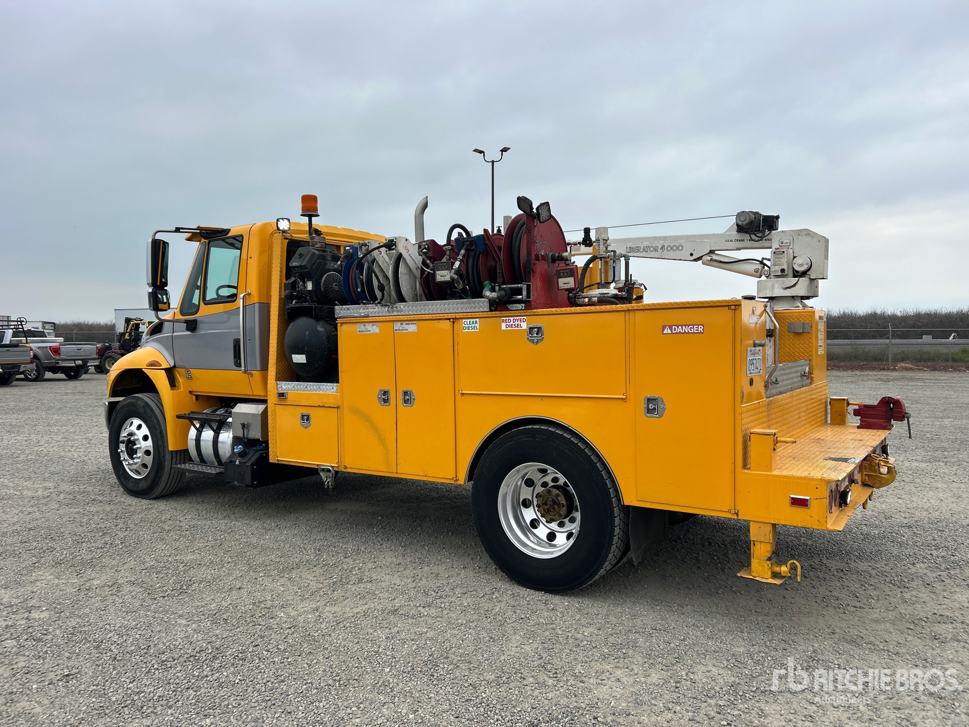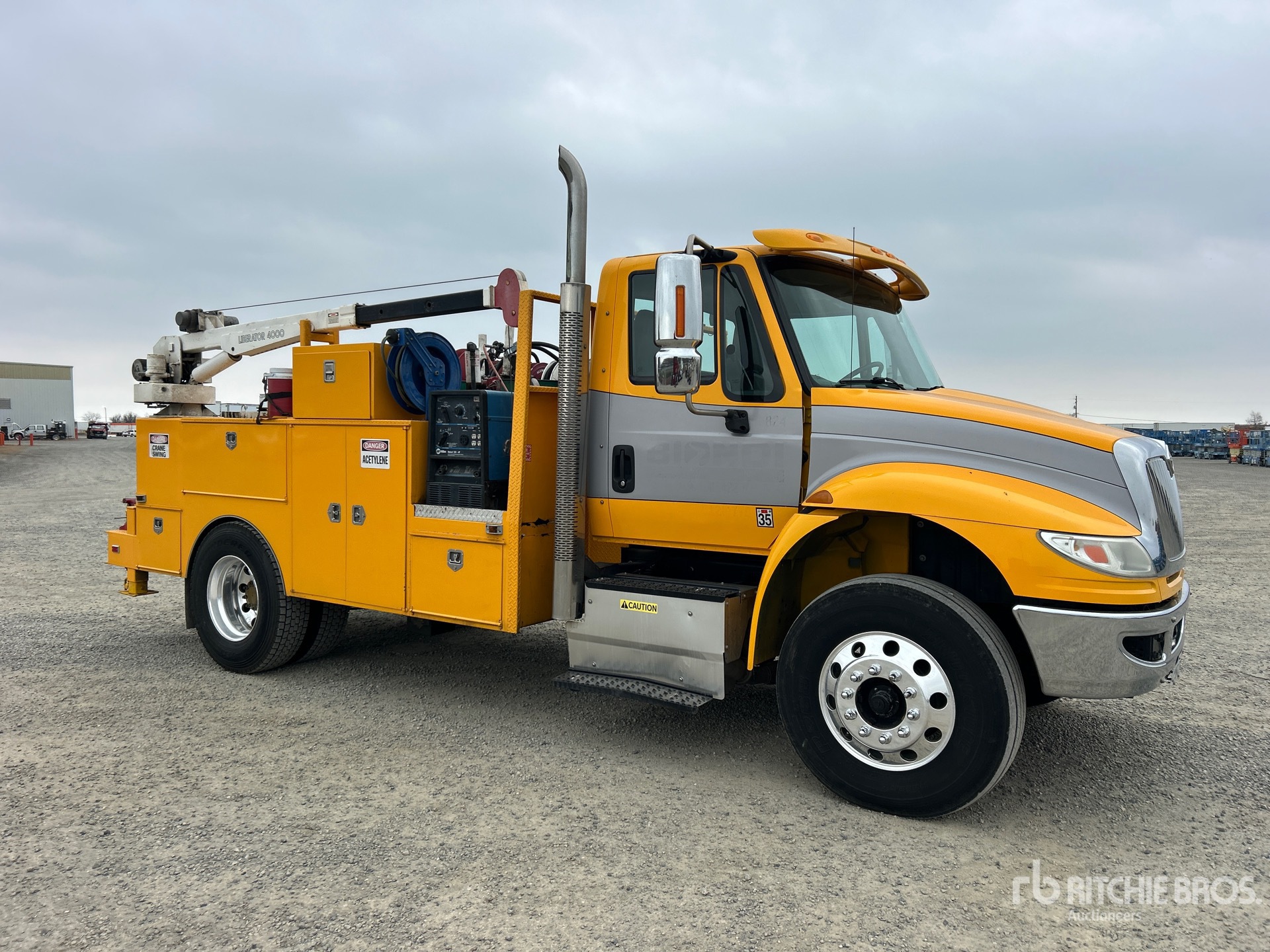 Navistar N9 6 Cylinder 9.3 L Diesel 315 hp Engine, 2014 US EPA Label, Requires Diesel Exhaust Fluid, 3489 Engine hrs, Allison Automatic Transmission, 12000 lb Front Axle, 20000 lb Rears, 32000 lb GVWR, Aluminum Wheels, 11R22.5, Air Ride Suspension, 172 in Wheelbase, 14 ft Body, Manual Stabilizers, Ideal Crane LIB 4 XTW PR 40000 lb 2 Section Hydraulic Crane, Wired Remote Control, Gasoline Air Compressor, Air Hose Reel, Miller Bobcat225 8500 W Gasoline Welder