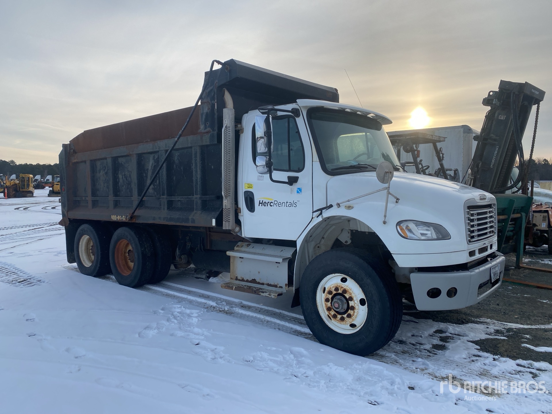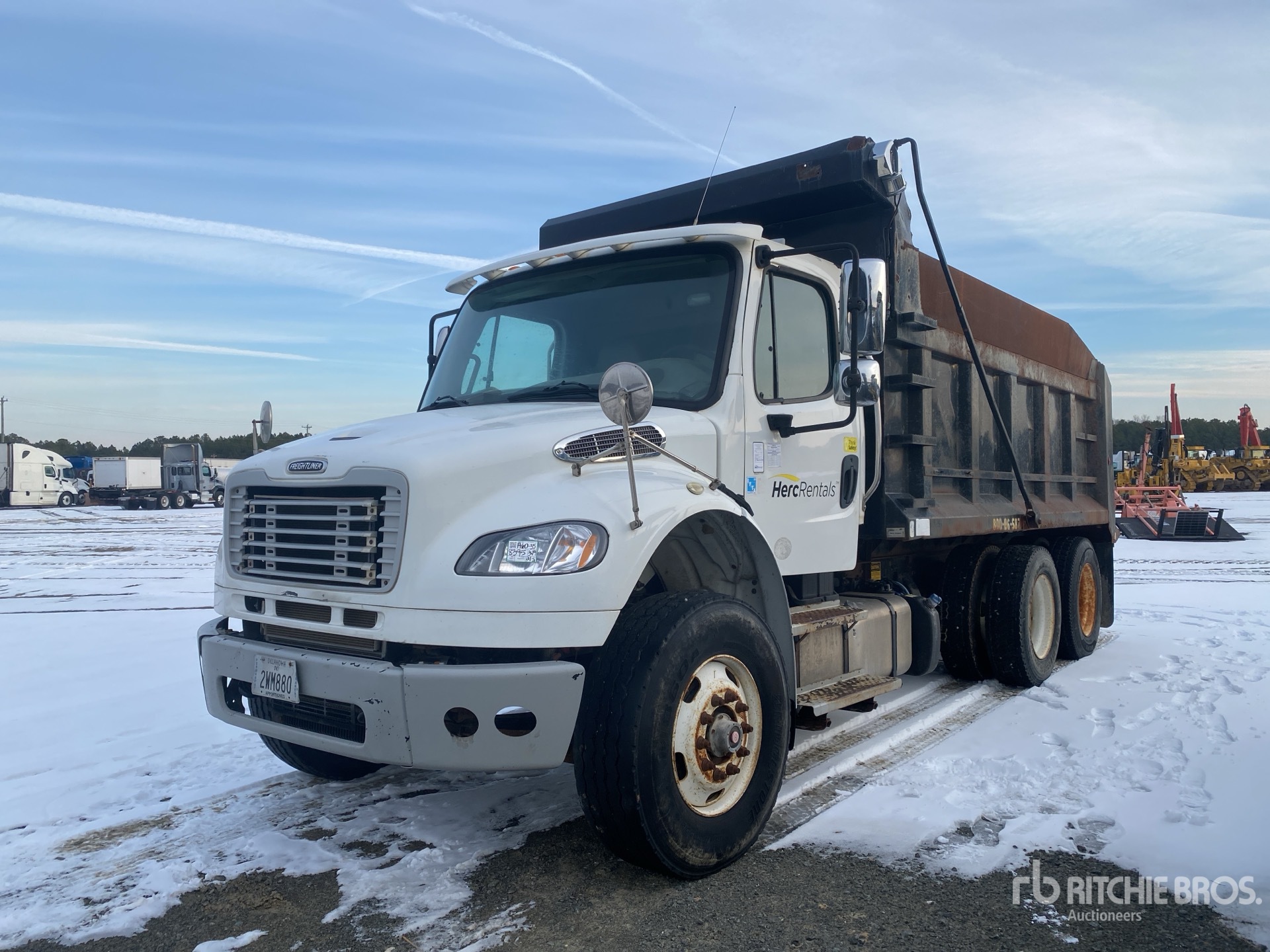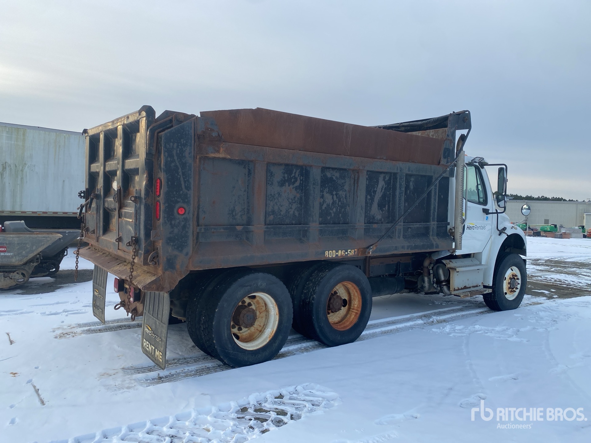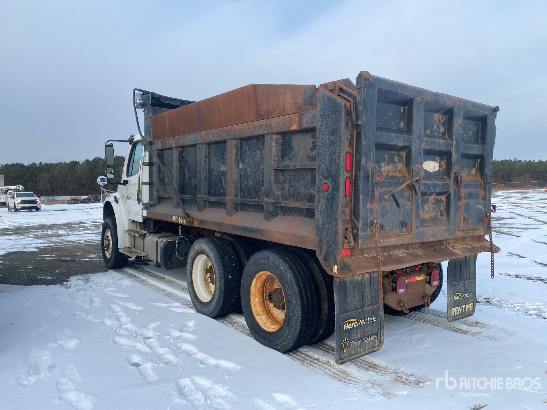 Cummins 6 Cylinder Diesel Engine, Requires Diesel Exhaust Fluid, Allison 3500 Automatic Transmission, Double Differential Locks, 18000 lb Front Axle, 40000 lb Rears, Meritor MT-40-14XP Drive Axles, 4.88:1 Axle Ratio, 58000 lb GVWR, Air Ride Cab, 315/80R22.5 Front Tires, 295/75R22.5 Rear Tires, Airliner Air Ride Suspension, 186 in Wheelbase, PTO, Wet Kit, 15 ft Long x 5 ft 2 in High Steel Body, Electric Roll Tarp, Double Tailgate Chutes, Equipment-from-Herc-Rentals