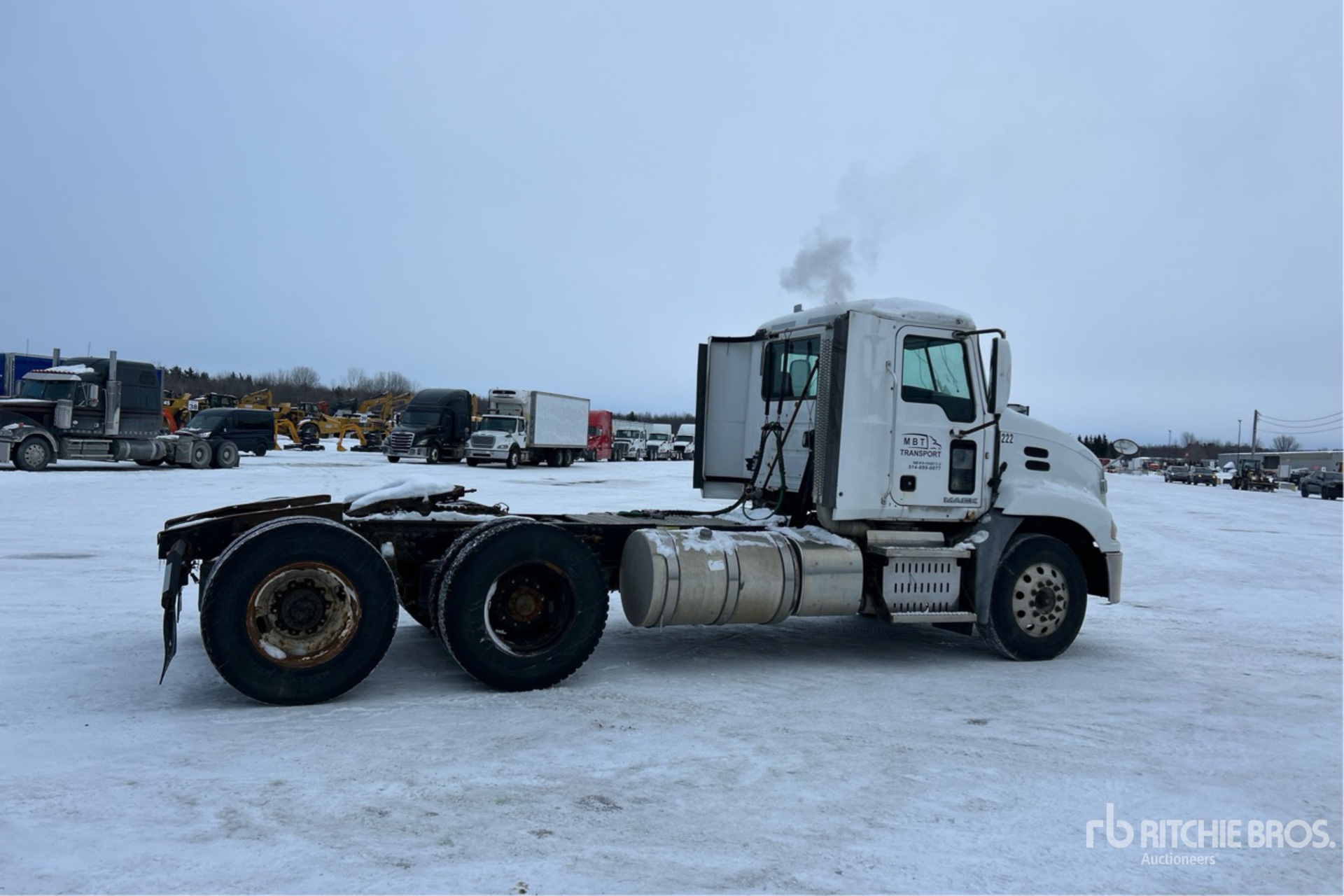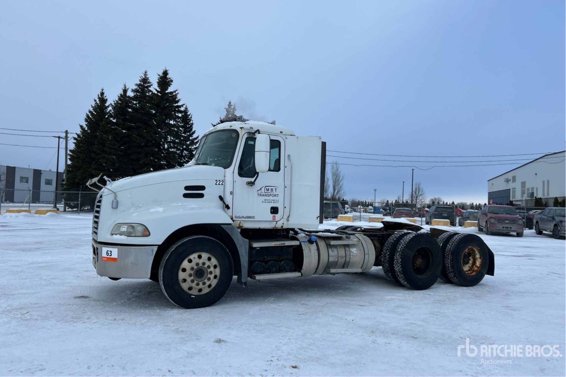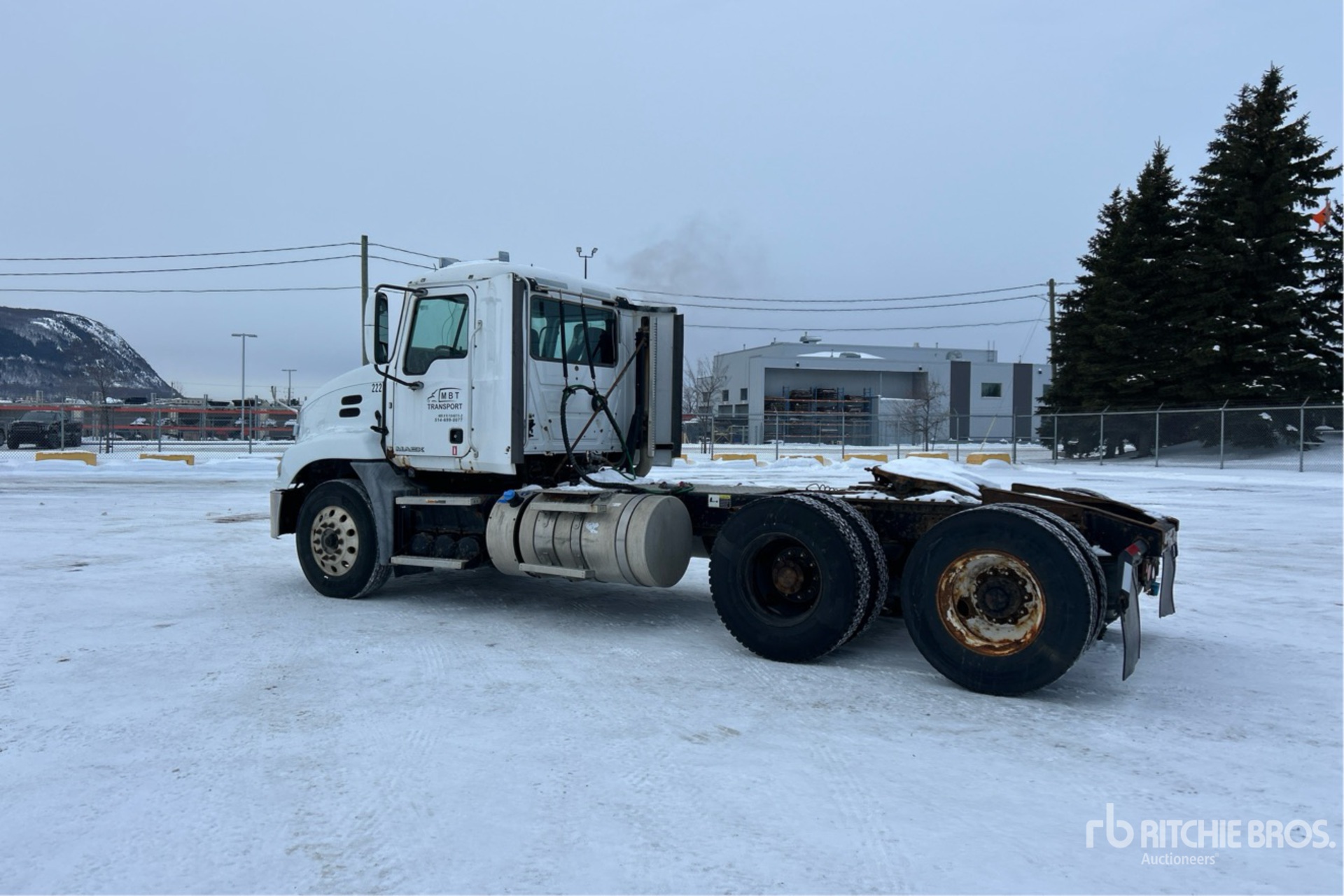 Located in Lane 11 Spot 9, Mack MP8 445 hp Engine, 2015 US EPA Label, Mack M Drive Automatic Transmission, 12000 lb Front Axle, 40000 lb Rears, 23587 kg GVWR, Engine Brake, Double Differential Locks, 194 in Wheelbase, Air Suspension, Aluminum Front Wheels, 11R22.5, Air Sliding 5th Wheel, Dual Fuel Tanks