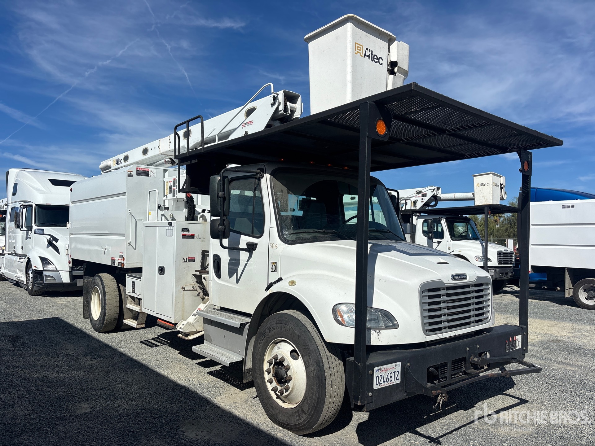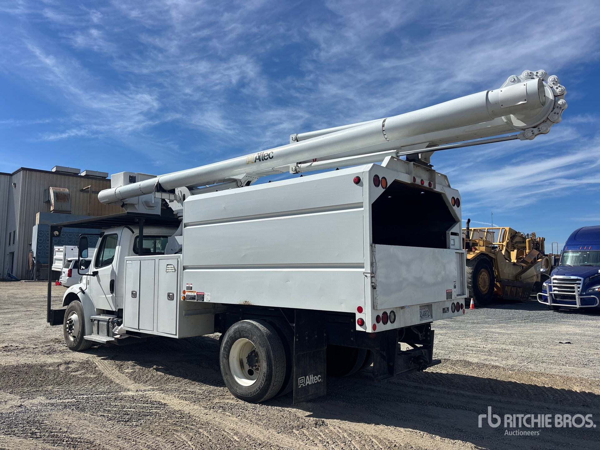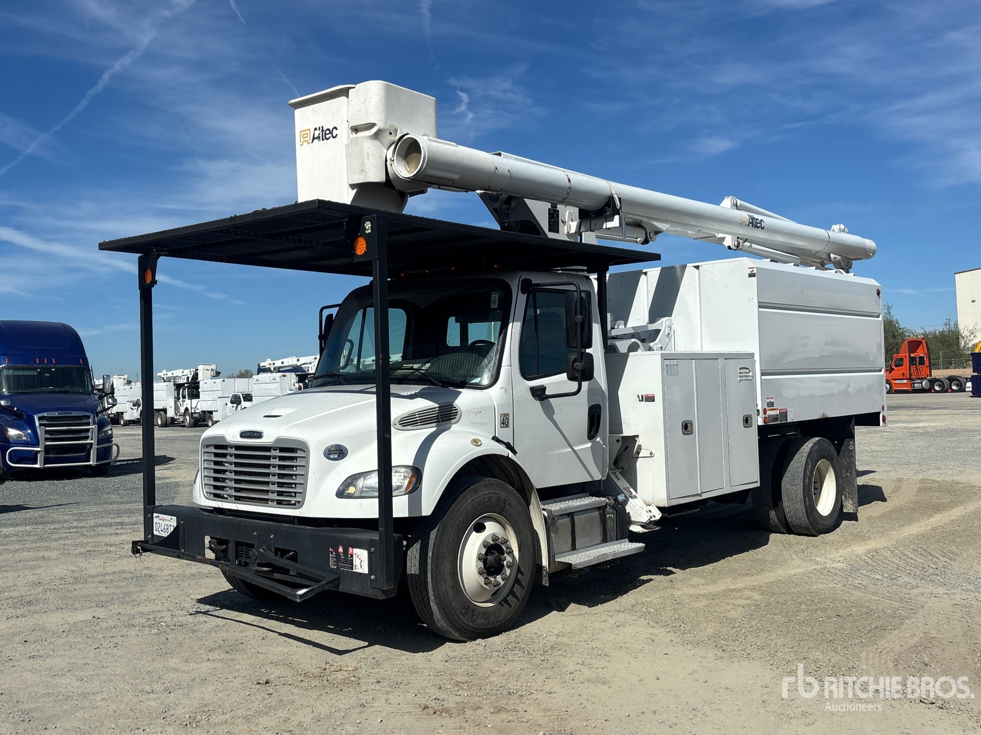 Located in Lane 11 Spot 13, Cummins ISB 6 Cylinder 6.7 L Diesel 250 hp Engine, 2017 US EPA Label, Requires Diesel Exhaust Fluid, 5093 Engine hrs, Eaton Fuller FS-6406A 6-Speed Manual Transmission, 13220 lb Front Axle, 21000 lb Rears, Meritor MS-21-14X Drive Axles, 4.63:1 Axle Ratio, 3300 lb GVWR, 11R22.5 Front Tires, 11R22.5 Rear Tires, Spring Suspension, 208 in Wheelbase, PTO, 400 lb Capacity, Front Mounted, One-Person Articulated Boom, Chip Body, A-Outriggers, 11 ft x 96 in Bed, Pintle Hitch