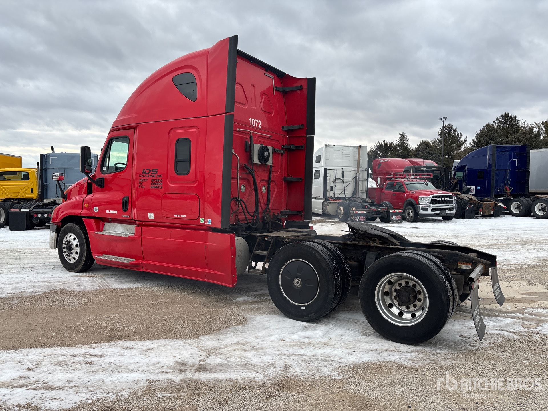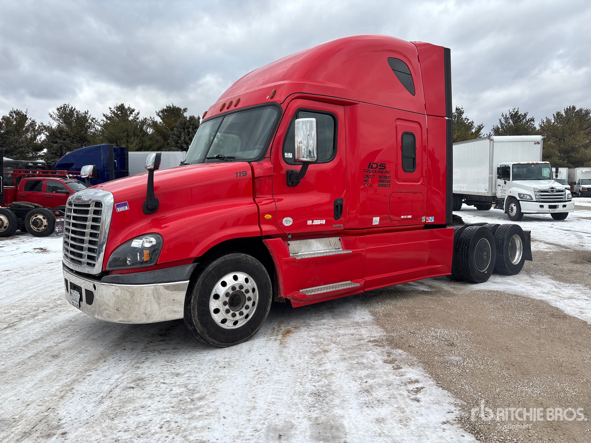 Located in Lane 19 Spot 37, Detroit DD15 400 hp Engine, 2017 US EPA Label, 21494 Engine hrs, Detroit DT12-DA-1750 12-Speed Automated Transmission, 12350 lb Front Axle, 40000 lb Rears, 52350 lb GVWR, Engine Brake, 72 in High Rise Sleeper Cab, Bunk Beds, Auxiliary Power Unit, 228 in Wheelbase, Air Suspension, Aluminum Wheels, 295/75R22.5 Front Tires, 295/75R22.5 Rear Tires, Air Sliding 5th Wheel, Dual Fuel Tanks