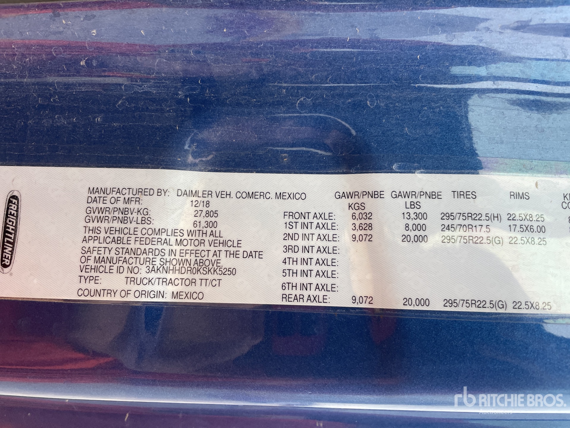 Detroit DD15 505 hp Engine, 2018 US EPA Label, 18133 Engine hrs, Detroit DT12-1750-OH1 12-Speed Automated Transmission, 13300 lb Front Axle, 40000 lb Rears, 61300 lb GVWR, 72 in Mid Roof Sleeper Cab, Bunk Beds, 275 in Wheelbase, Air Suspension, Air Lift Pusher Axle, 295/75R22.5, Air Sliding 5th Wheel, Dual Fuel Tanks