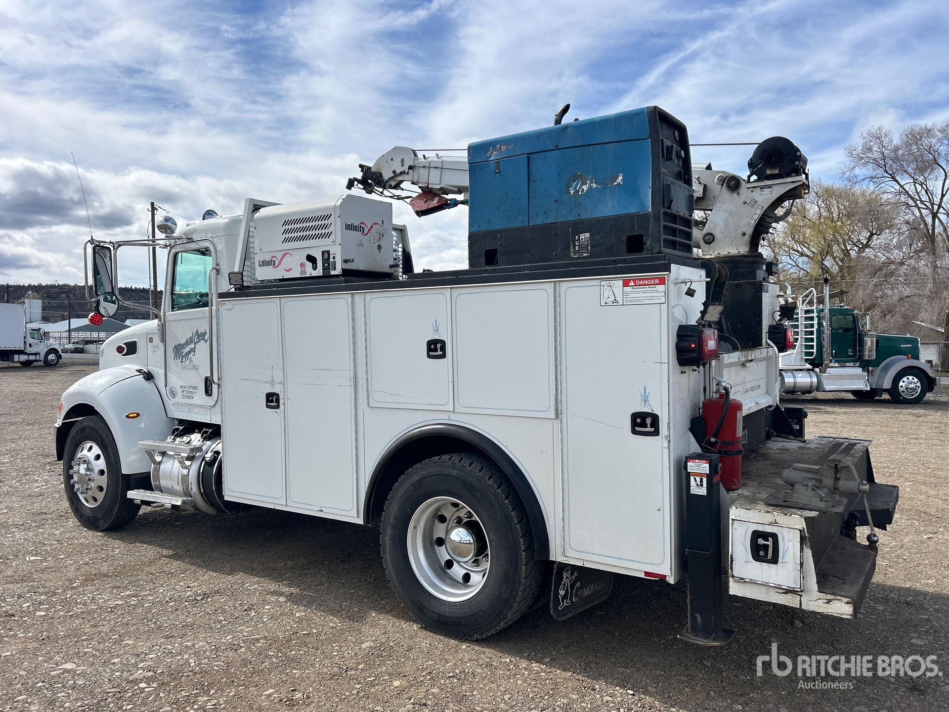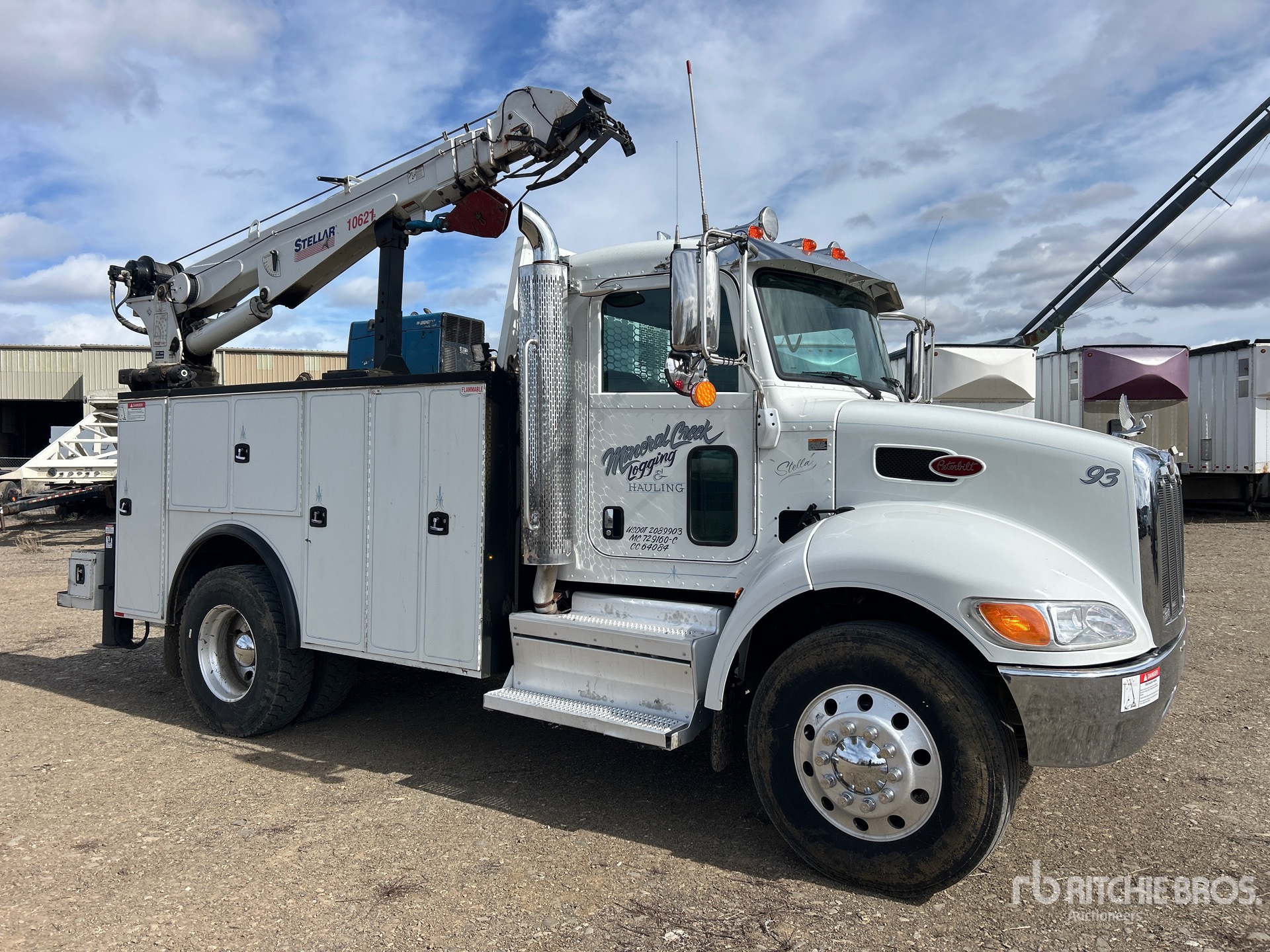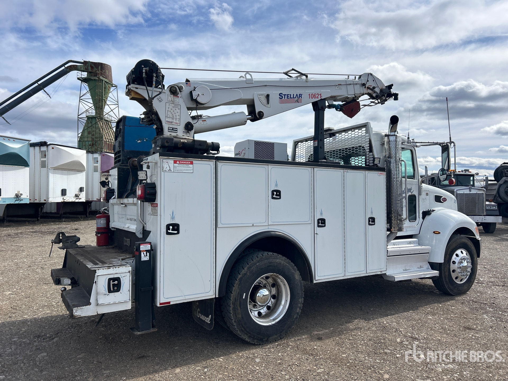 Paccar PX-9 6 Cylinder Diesel 300 hp Engine, Requires Diesel Exhaust Fluid, 5206 Engine hrs, Allison 3500 Automatic Transmission, Differential Lock, 10000 lb Front Axle, 20000 lb Rears, Dana P20060S Drive Axles, 5.29:1 Axle Ratio, 26000 lb GVWR, Aluminum Wheels, 11R22.5, Spring Suspension, 158 in Wheelbase, PTO, Knapheide 11 ft Body, Hydraulic Stabilizers, Stellar 10621 10000 lb 3 Section Hydraulic Crane, Wireless Remote Control, Boss Infinity 80 PTO Air Compressor, Air Hose Reel, Miller Trailblazer 10 kW Gasoline Welder