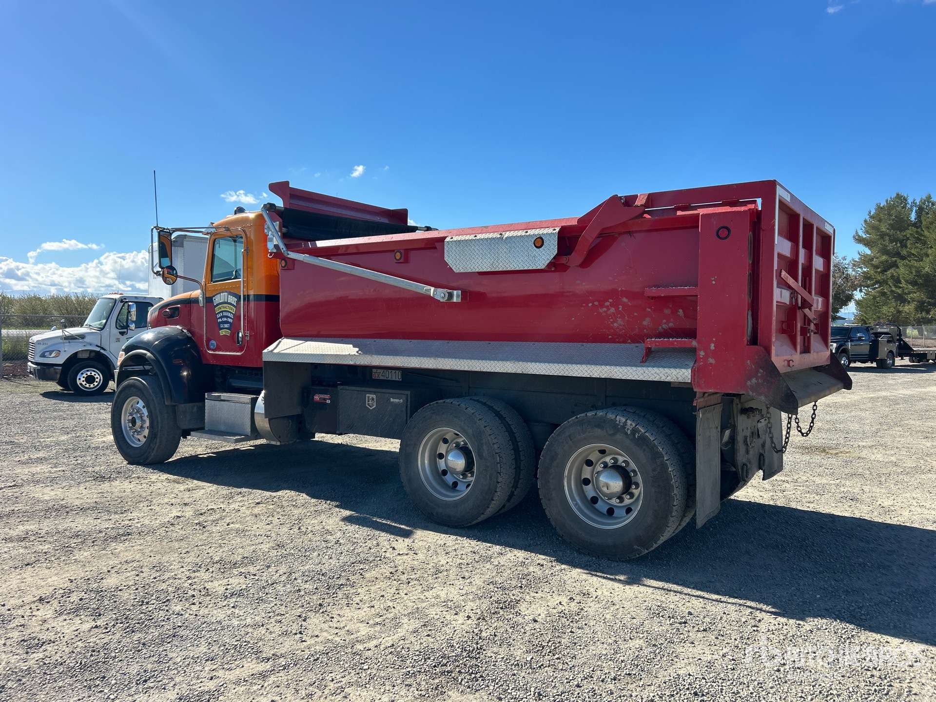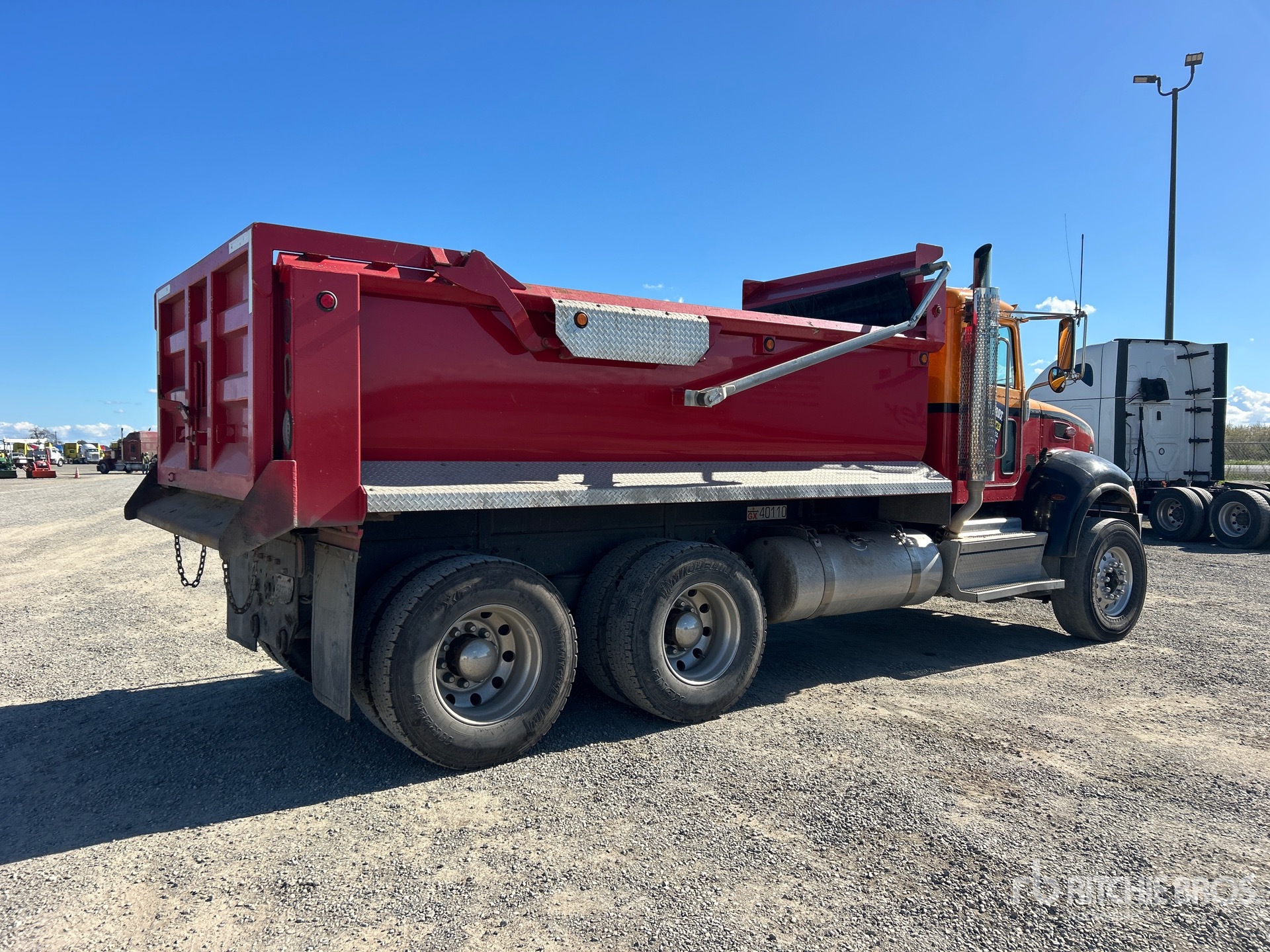 Paccar PX-9 8.9 L Diesel 370 hp Engine, 2019 US EPA Label, Requires Diesel Exhaust Fluid, 4113 Engine hrs, Allison Automatic Transmission, 20000 lb Front Axle, 40000 lb Rears, 60000 lb GVWR, Aluminum Wheels, 315/80R22.5, Dual Steering Boxes, Air Ride Suspension, 205 in Wheelbase, PTO, 15 ft Long x 3 ft 6 in High Steel Body, Round Bottom, Electric Roll Tarp, High-Lift Tailgate, Tailgate Chute