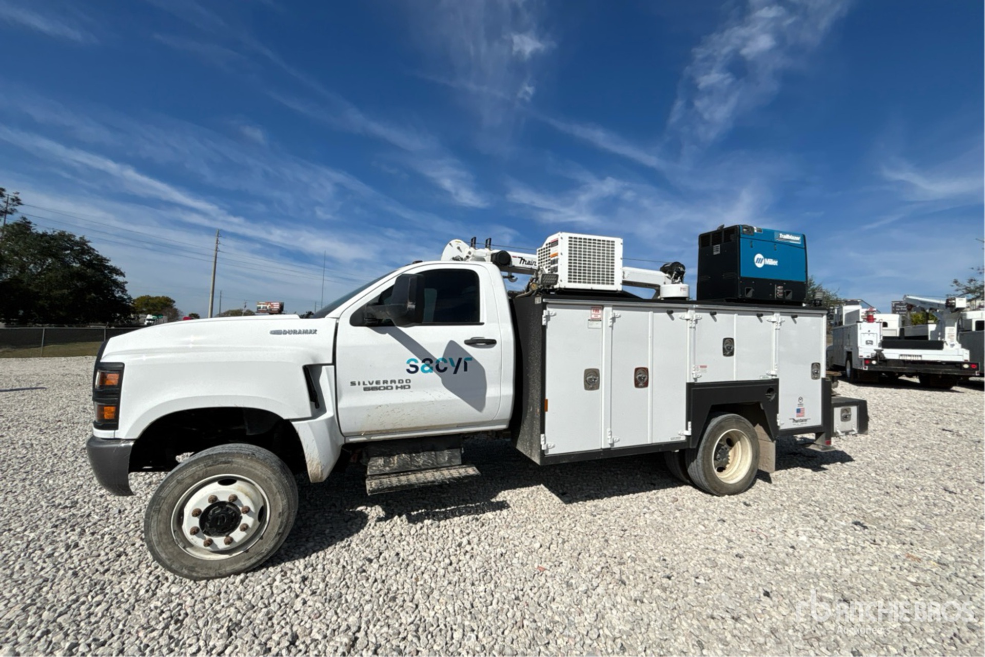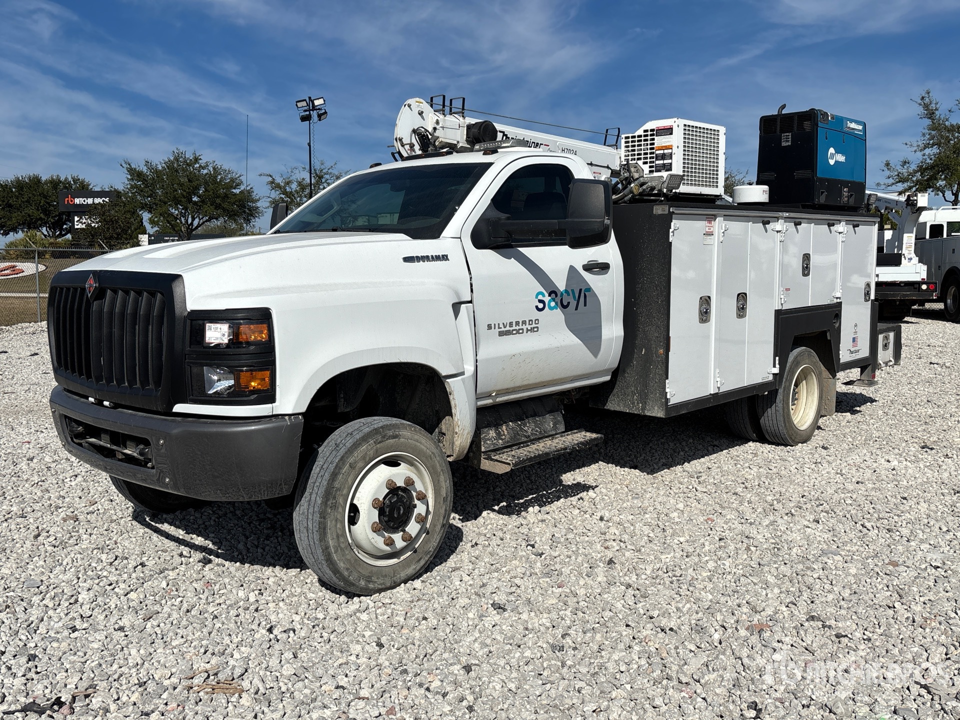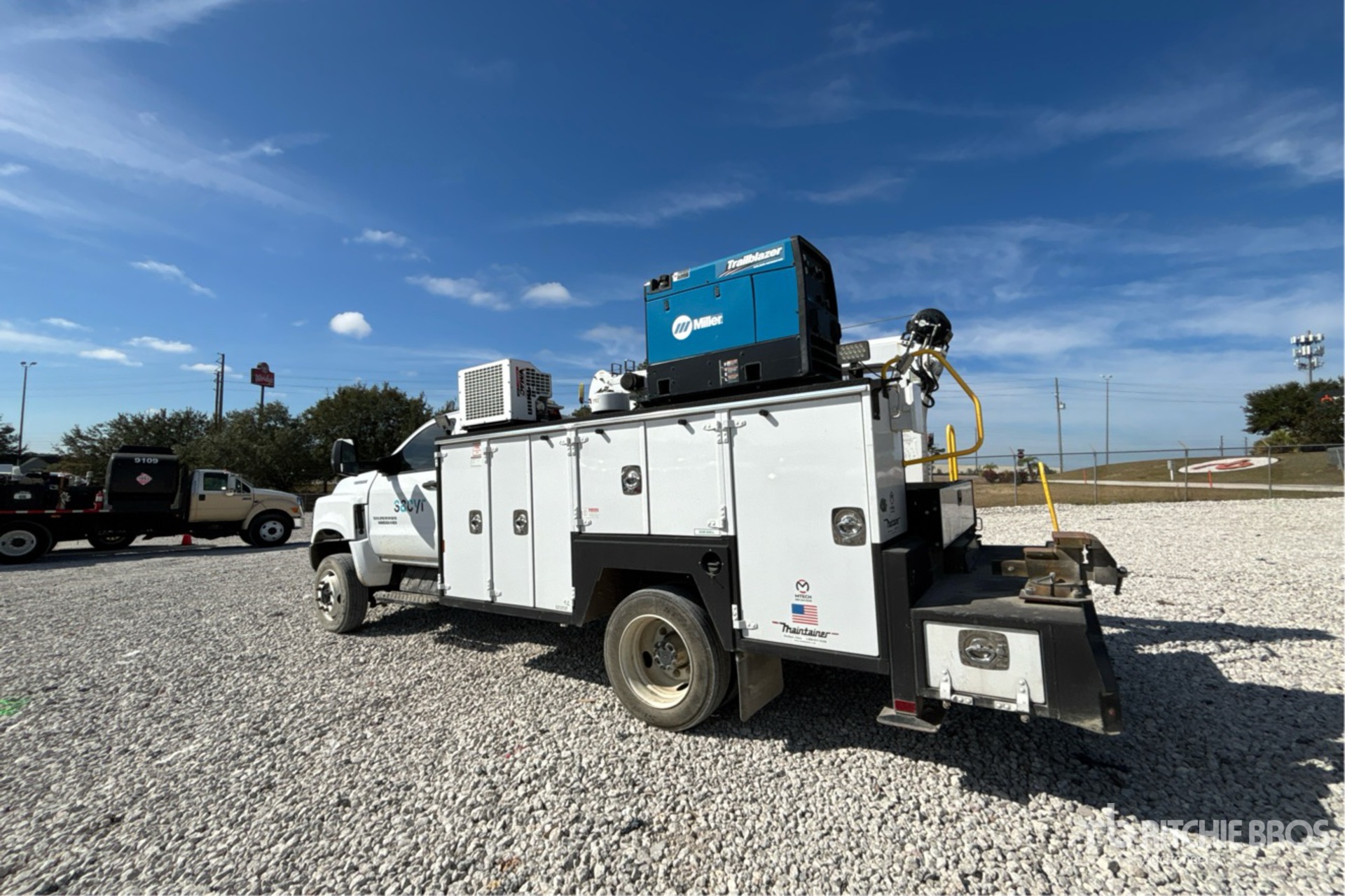 Located in Lane 94 Spot 16, International 350 V8 6.6 L Diesel 350 hp Engine, 2022 US EPA Label, CARB Compliant, Requires Diesel Exhaust Fluid, 2861 Engine hrs, Exhaust Brake, Allison Automatic Transmission, 7500 lb Front Axle, 15000 lb Rears, 19500 lb GVWR, 225/70R19.5, Spring Suspension, 165 in Wheelbase, PTO, 2023 Maintainer 13 ft 8 in Body, Hydraulic Stabilizers, 2023 Maintainer H7024 7000 lb 3 Section Hydraulic Crane, Wireless Remote Control, VMAC H40 Hydraulic Air Compressor, Air Hose Reel, Miller Trailblazer 325 10 kW 325 A Gasoline Welder