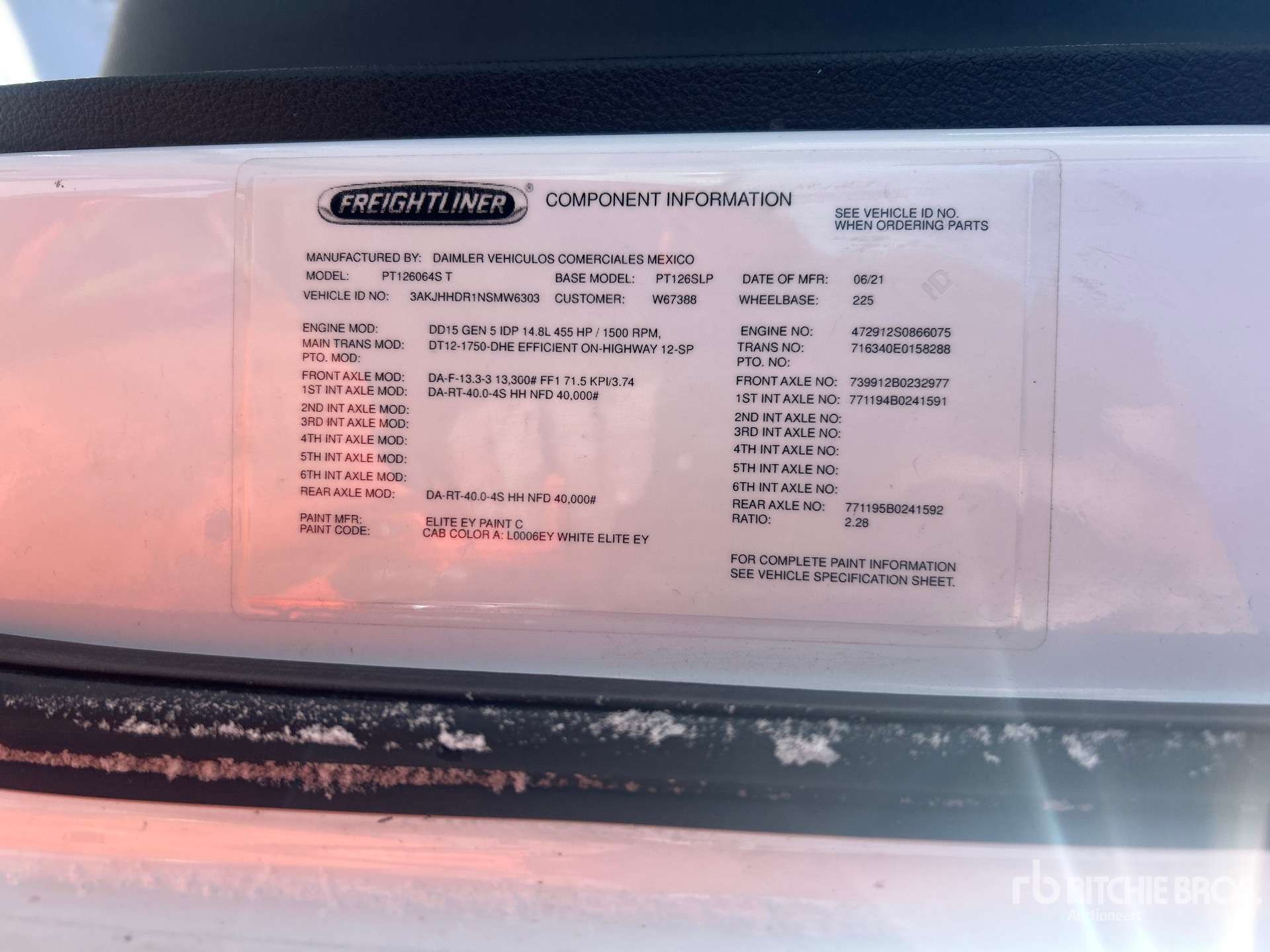 Detroit DD15 505 hp Engine, 2021 US EPA Label, 10044 Engine hrs, 13220 lb Front Axle, 40000 lb Rears, 53220 lb GVWR, Engine Brake, Double Differential Locks, 70 in High Rise Sleeper Cab, 225 in Wheelbase, Air Suspension, Aluminum Wheels, 11R22.5, Air Sliding 5th Wheel, Dual Fuel Tanks