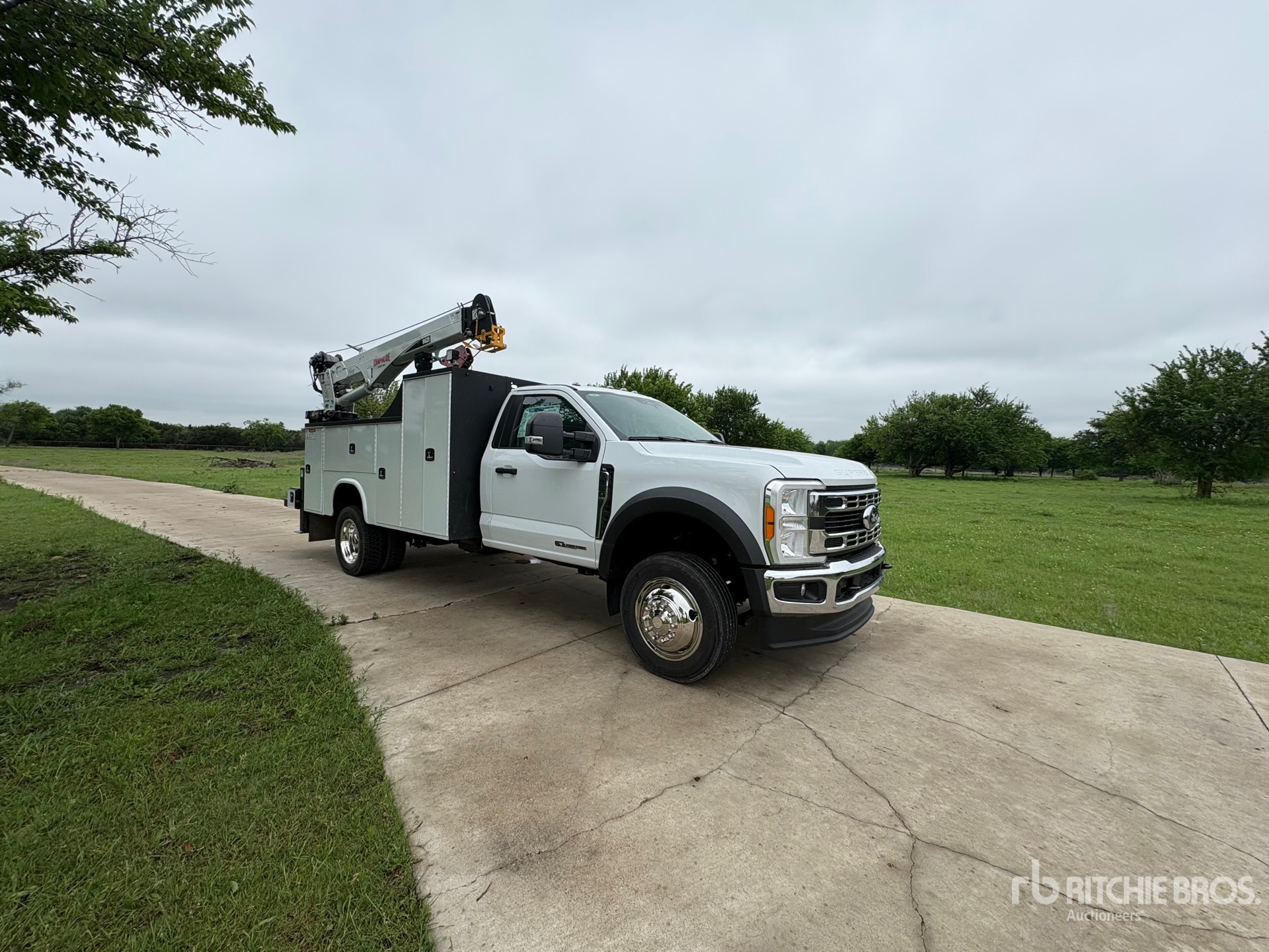 Powerstroke V8 6.7 L Diesel Engine, Automatic Transmission, 225/70R19.5 Front Tires, 225/70R19.5 Rear Tires, Spring Suspension, PTO, 2024 Knapheide Body, Hydraulic Stabilizers, 2024 Stellar 8621 8600 lb Crane, Wireless Remote Control, Hydraulic Air Compressor, Air Hose Reel, UNUSED Lincoln Eagle 10000 PLUS Welder / Generator