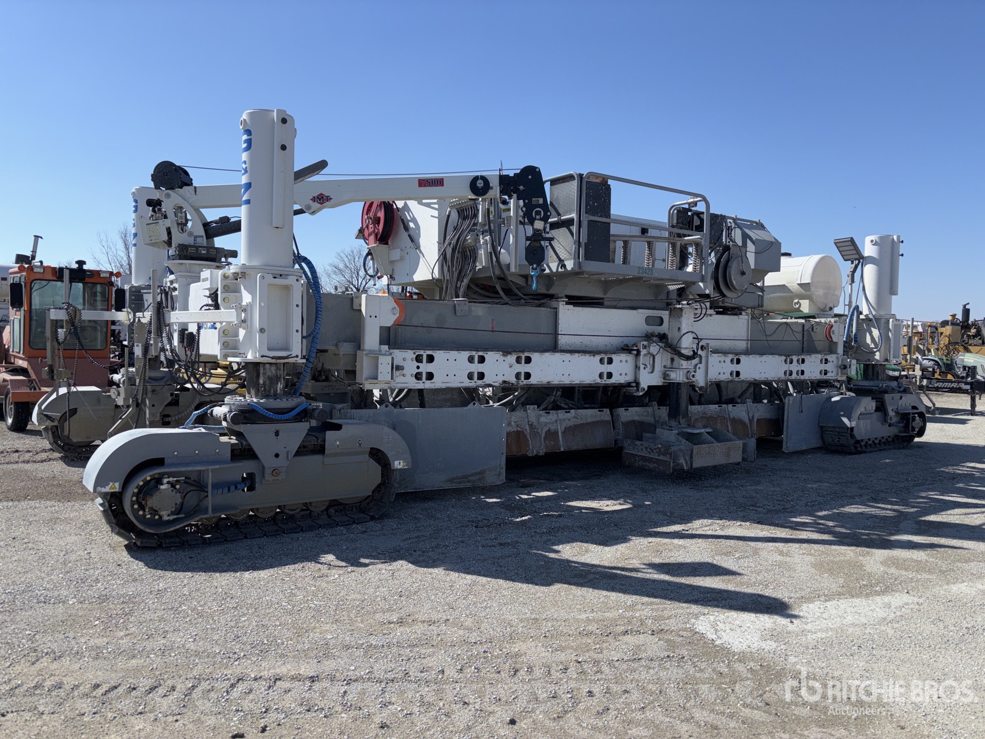 Wireless controller, Tie bar inserter, hydraulic pucks, telescopic screed ends, IMT 7500 crane