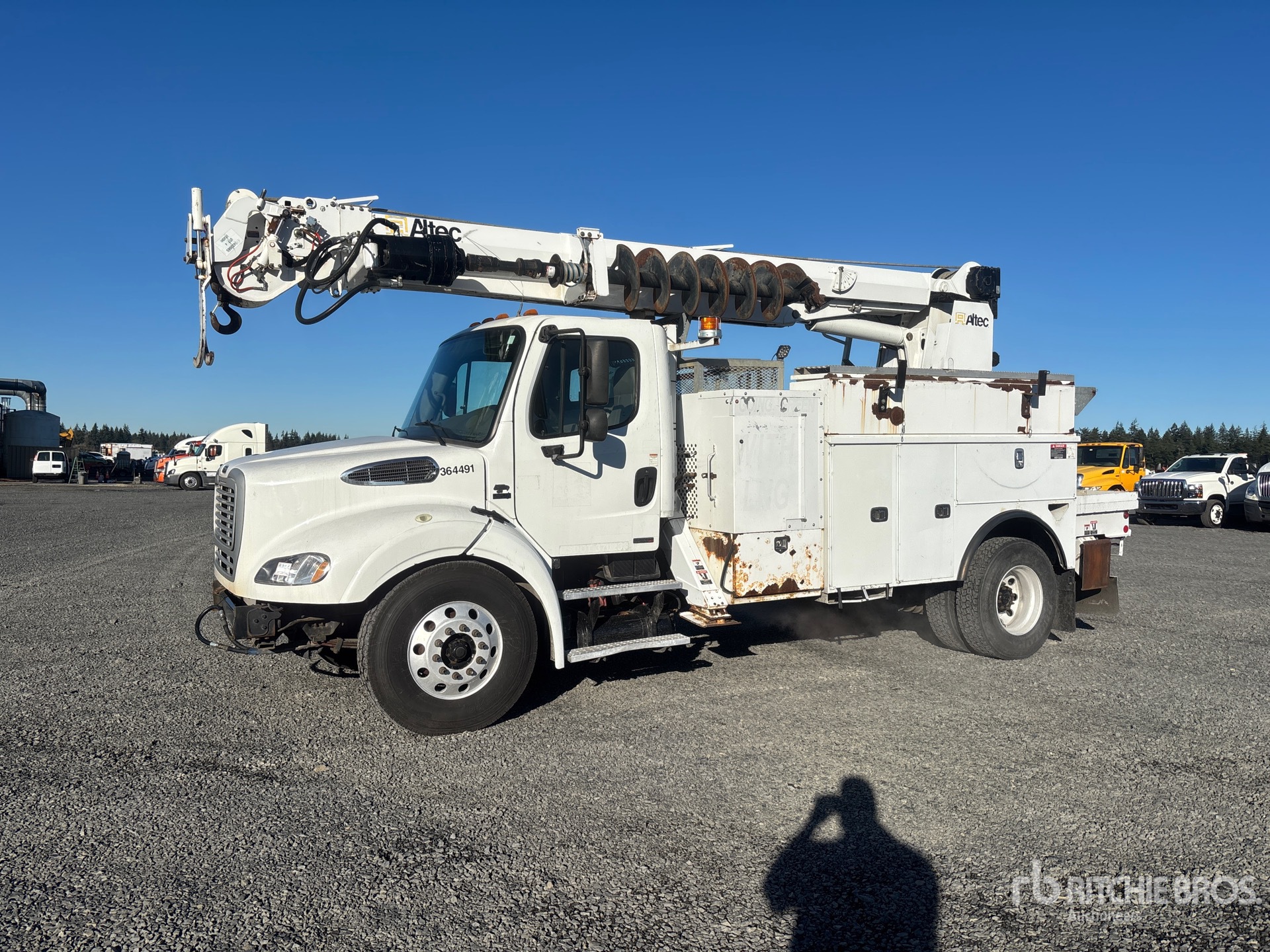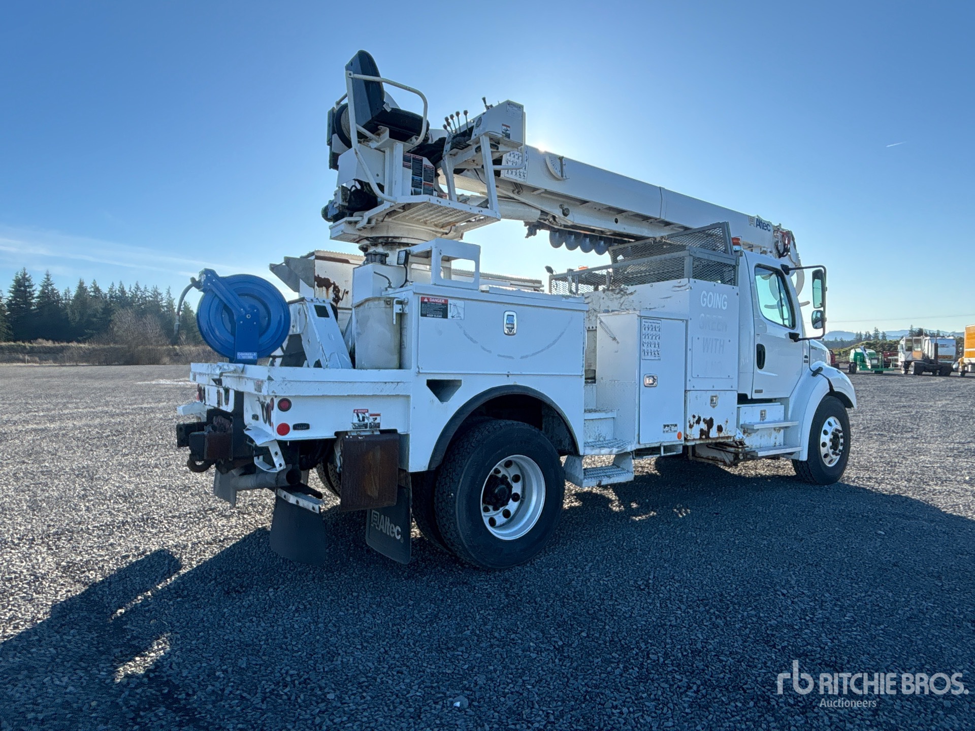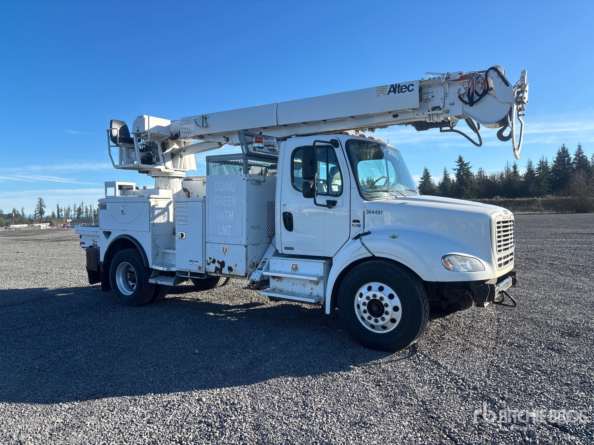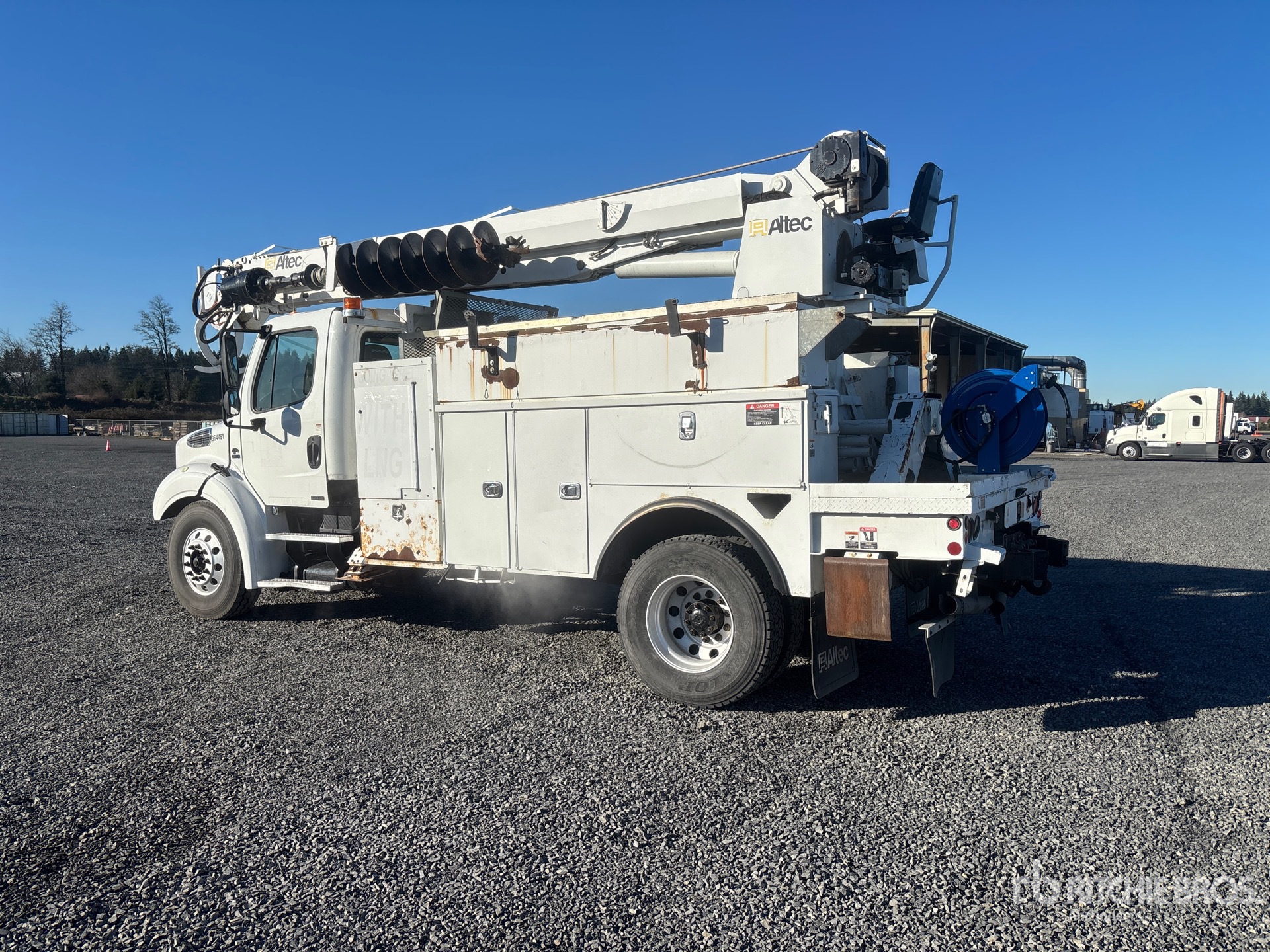 Cummins ISL G 6 Cylinder 8.9 L Liquefied Natural Gas (LNG) 320 hp Engine, 10987 Engine hrs, Allison 3000 Automatic Transmission, 13220 lb Front Axle, 21000 lb Rears, 6.14:1 Axle Ratio, 33000 lb GVWR, Air Ride Cab, Aluminum Wheels, 12R22.5 Front Tires, 11R22.5 Rear Tires, Spring Suspension, 191 in Wheelbase, PTO, 47 ft Sheave Height, 23790 lb Capacity, Rear Mounted, 20 ft Reach, 20 in Auger, Boom Tip Mounted Winch, Altec 9 ft Body, X-Type Outriggers, Rear Outriggers, Hydraulic Hose Reel