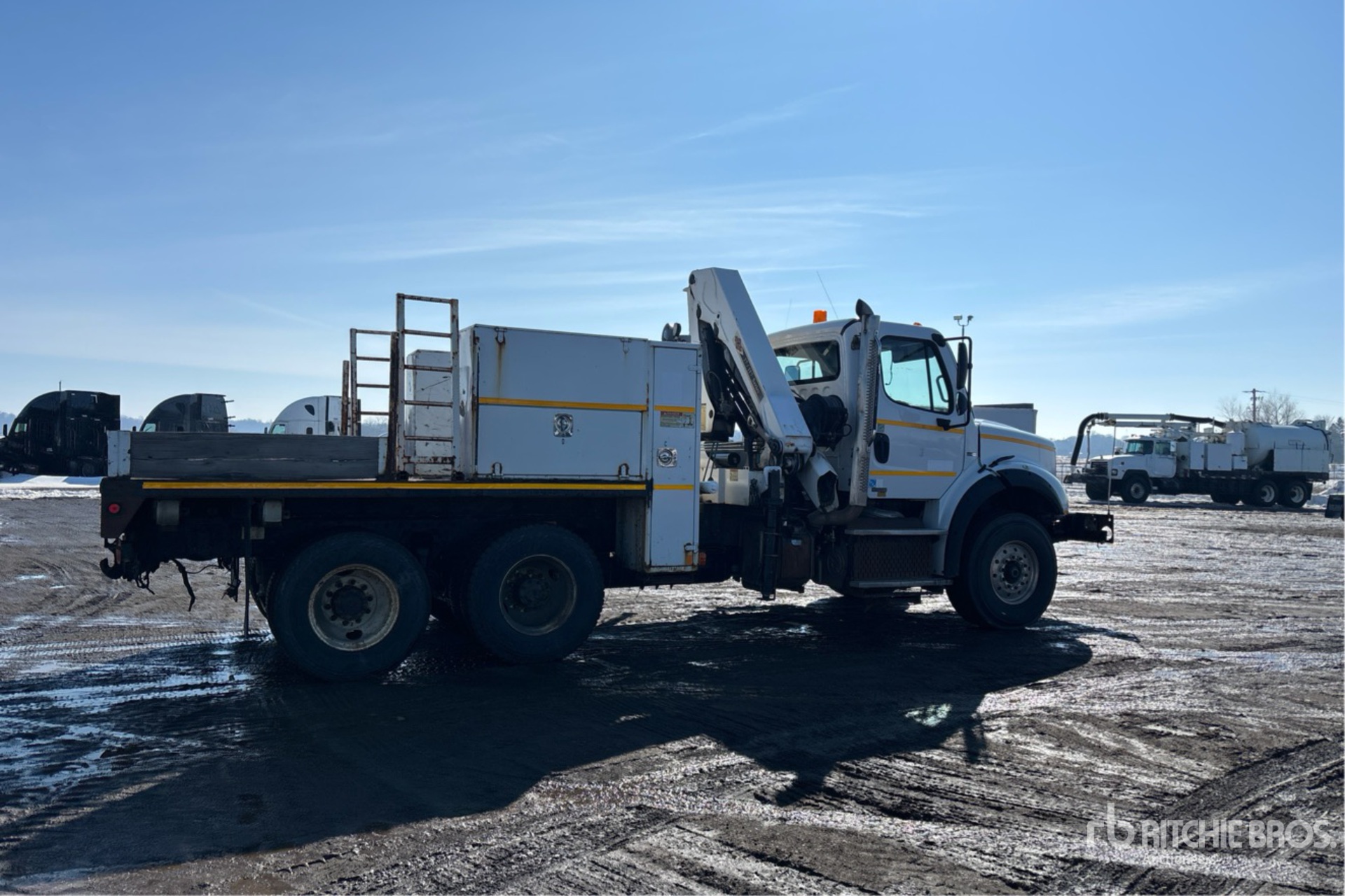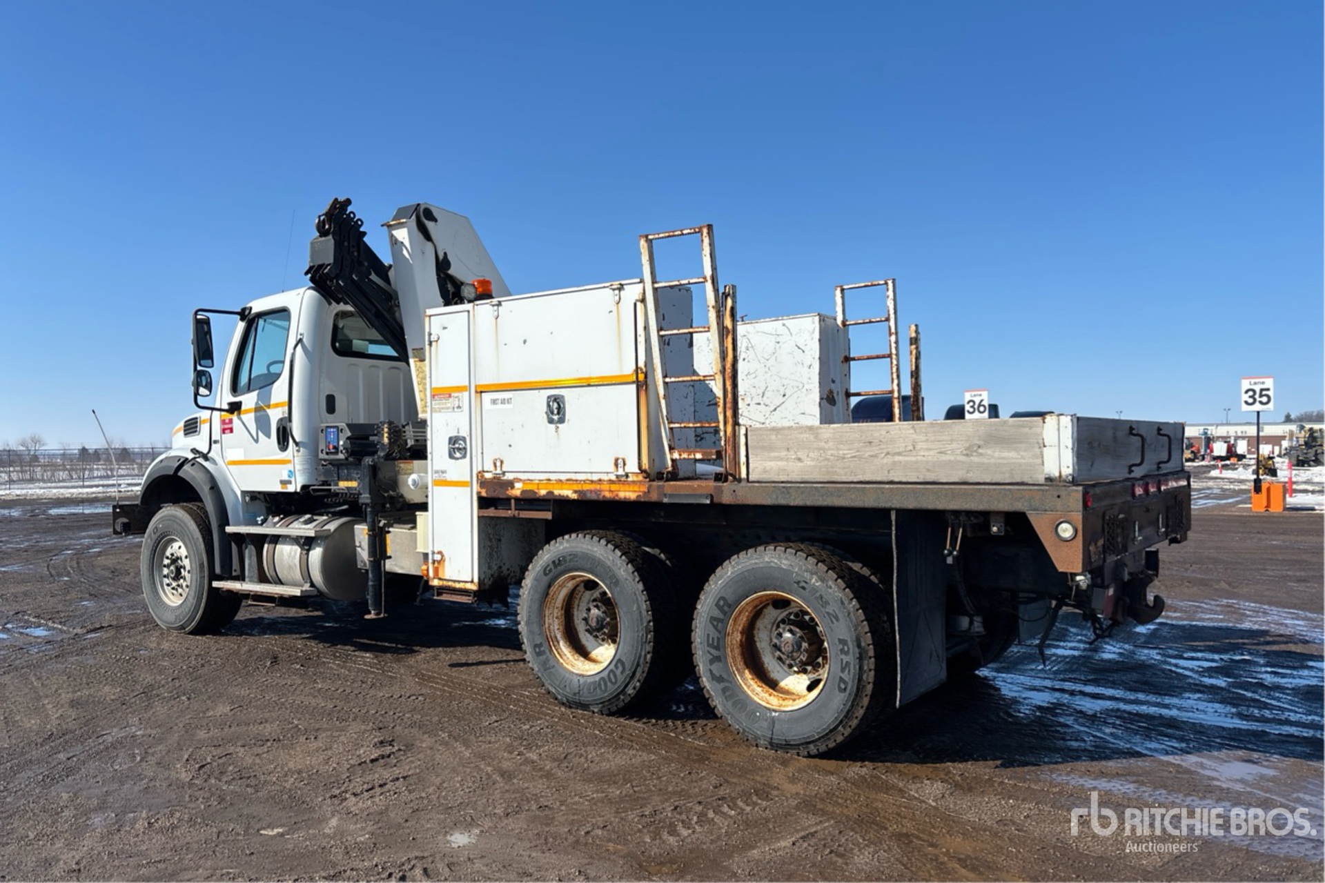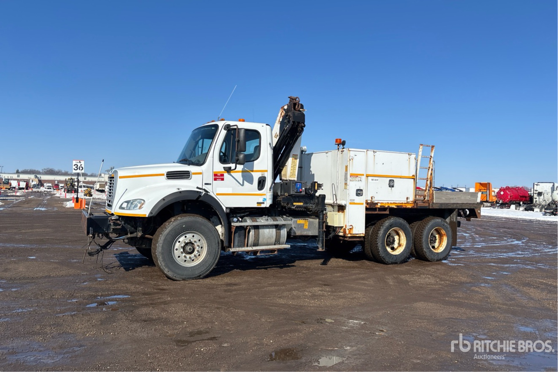 Located in Lane 9 Spot 24, Detroit DD13 6 Cylinder 12.8 L Diesel Engine, 2012 US EPA Label, Eaton Fuller RTO-16908LL 8LL Manual Transmission, Differential Lock, 425/65R22.5 Front Tires, 11R22.5 Rear Tires, Airliner Air Ride Suspension, 207 in Wheelbase, PTO, 9 ft - 50 ft 3 Section Boom, Out and Down Outriggers, Cordless Remote Control, Imt 17/117 5200 lb 2 Section Hydraulic Crane, 13 ft 6 in x 96 in Bed, Pintle Hitch, Detroit DD13 6 Cylinder 12.8 cid Diesel 410 hp Engine, 2012 US EPA Label, Requires Diesel Exhaust Fluid, 9095 Engine hrs, Air Conditioner, Cruise Control, Engine Brake, Eaton Fuller RTO-16908LL 8LL Manual Transmission, Differential Lock, 20000 lb Front Axle, 40000 lb Rears, 3.90:1 Axle Ratio, 60000 lb GVWR, Air Ride Cab, Aluminum Front Wheels, 425/65R22.5 Front Tires, 11R22.5 Rear Tires, Dual Steering Boxes, Double Frame, Air Ride Suspension, 207 in Wheelbase, PTO, 14 ft 6 in Body, Hydraulic Stabilizers, IMT 17/117SLK4 11465 lb 6 Section Hydraulic Crane, Wireless Remote Control