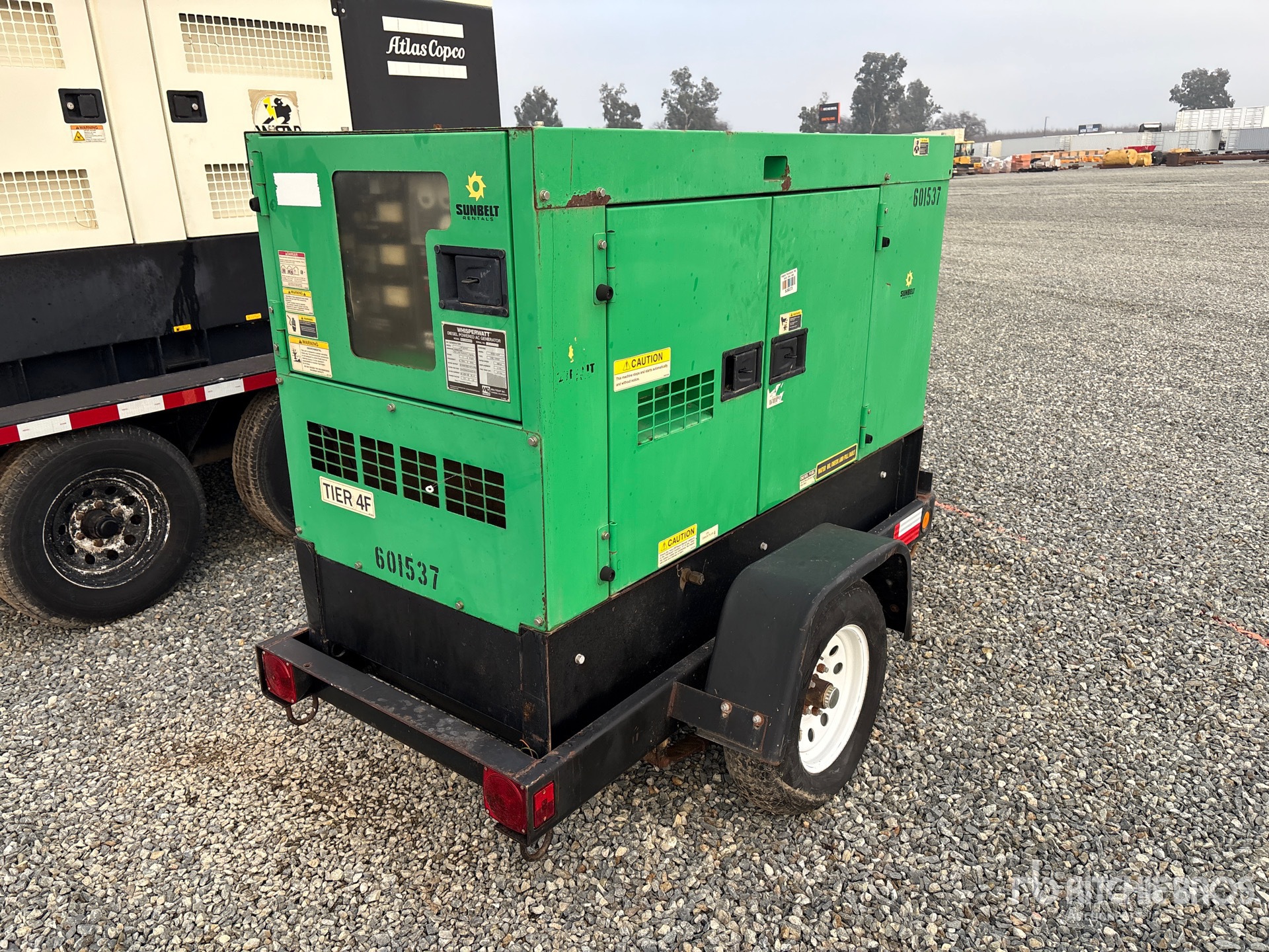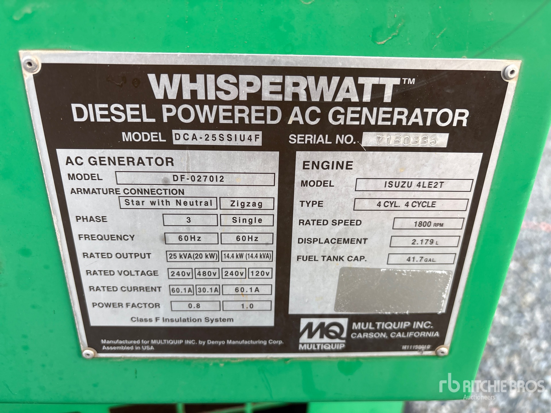 2014 US EPA Label, Isuzu BZ-4LE2T 4 Cylinder 2.2 L Diesel Engine, Requires Diesel Exhaust Fluid, 25 kVA/20 kW Rated 3 Phase Output, 240 V / 480 V Rated Voltage, 14.4 kVA,/14.4 kW, Rated Single Phase Output, 240 V / 120 V Rated Voltage, Ball Hitch Carrier Trailer