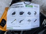 (1) Rake, (1) Ripper, (1) Quick Hitch, (1) Grapple, (1) Auger w/ 8 in & 12 in Auger Bits, (1) 8 in Narrow Bucket, (1) 31 in Bucket