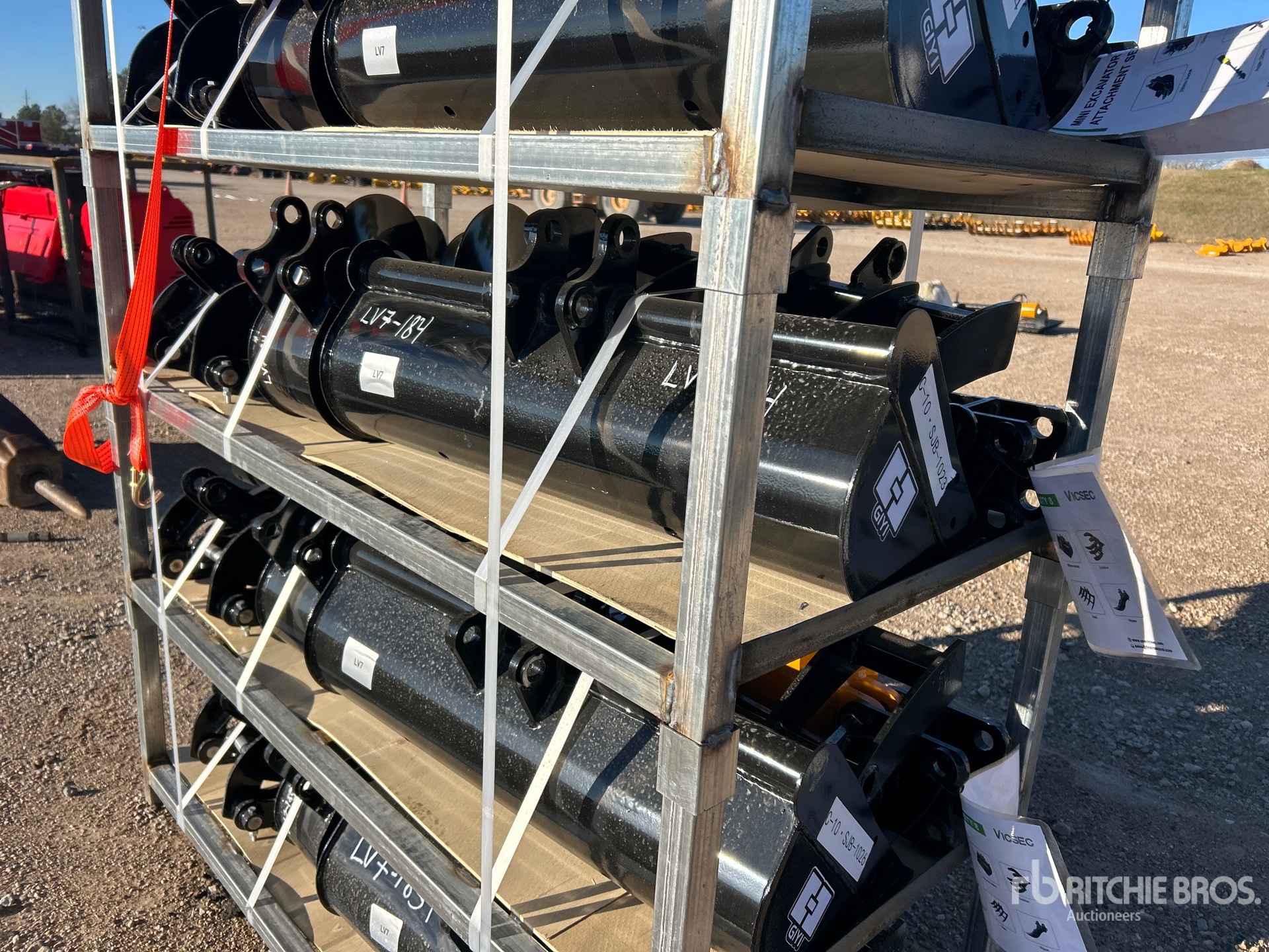 (1) Rake, (1) Ripper, (1) Grapple, (1) Auger w/ 12 in & 16 in Auger Bits, (1) 8 in Narrow Bucket, (1) 24 in Bucket, (1) 32 in Bucket