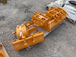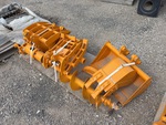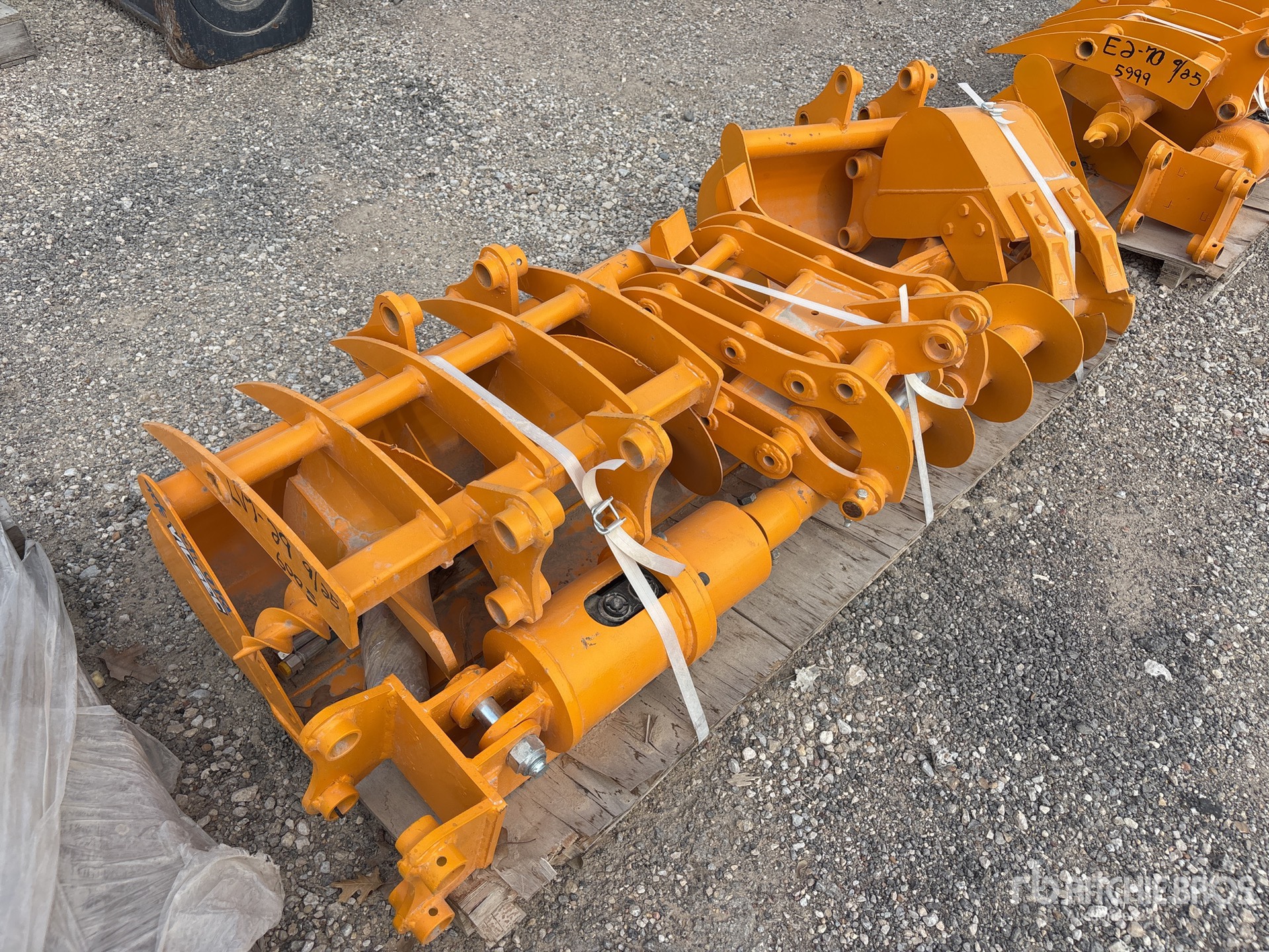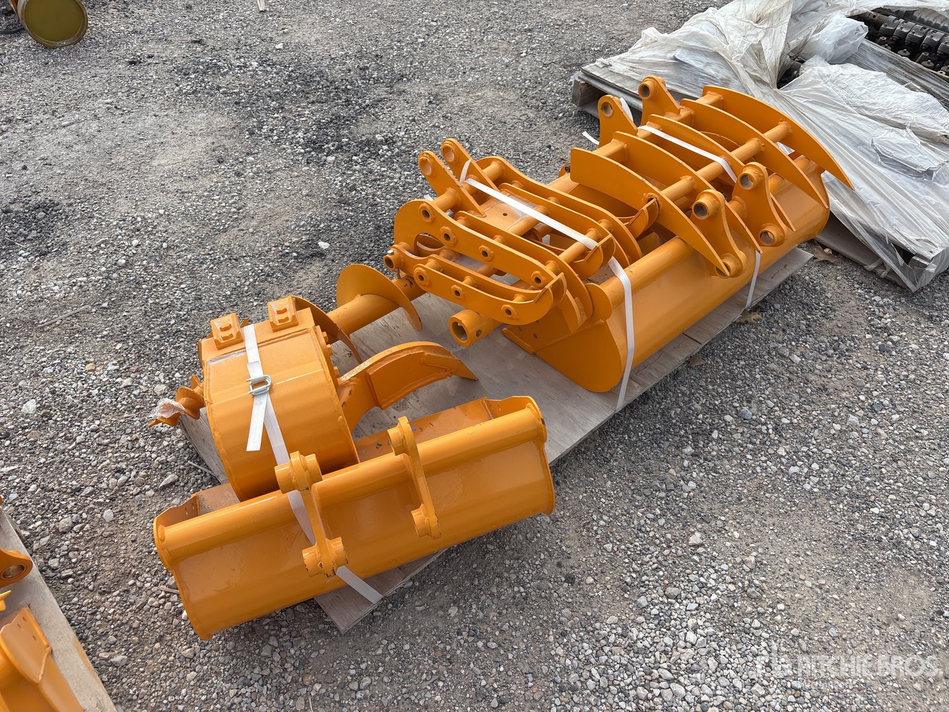 (3) Buckets, (1) Rake, (1) Grapple, (1) Ripper, (1) Auger w/bit, (1) Auger bit, One pallet