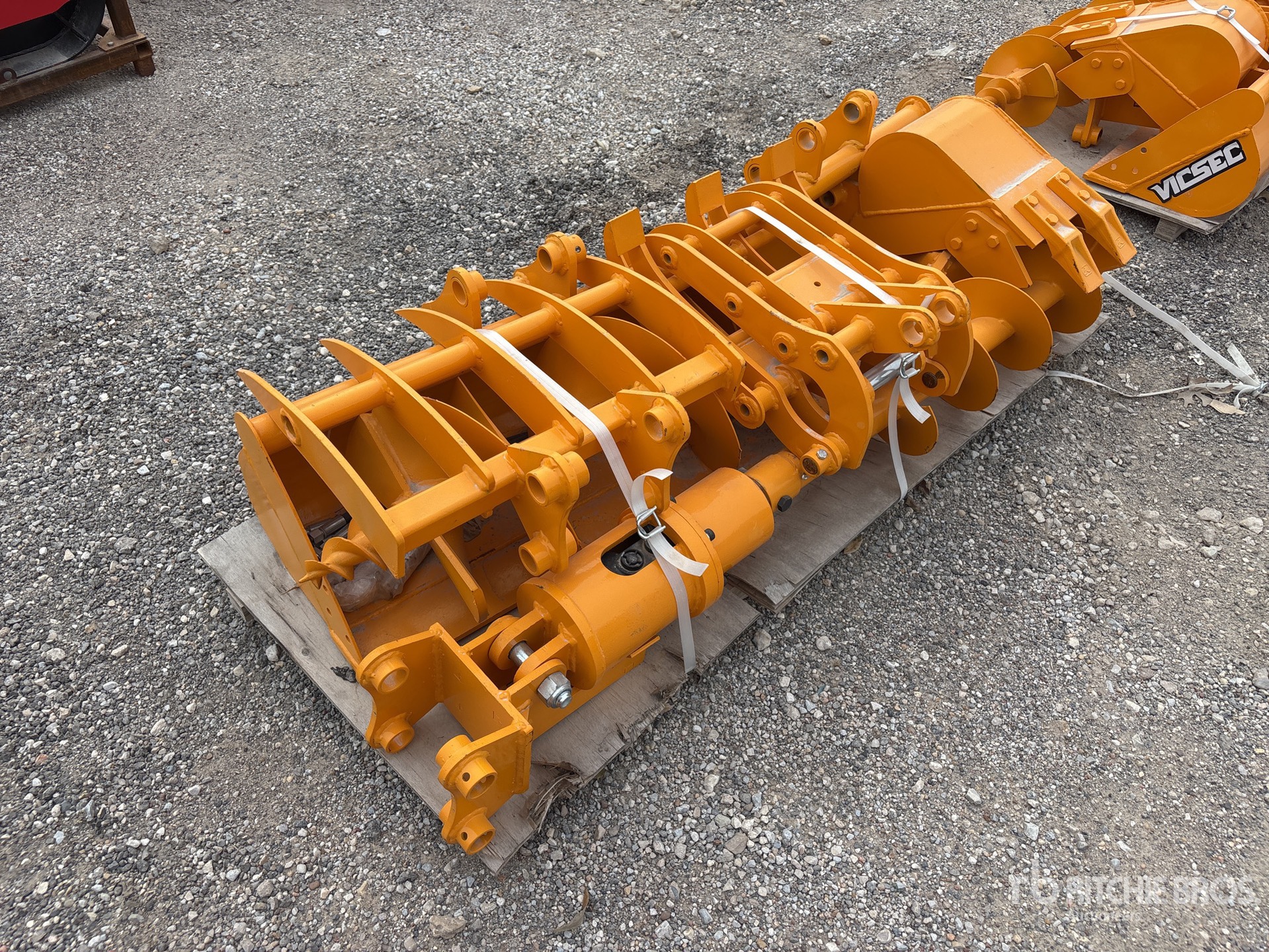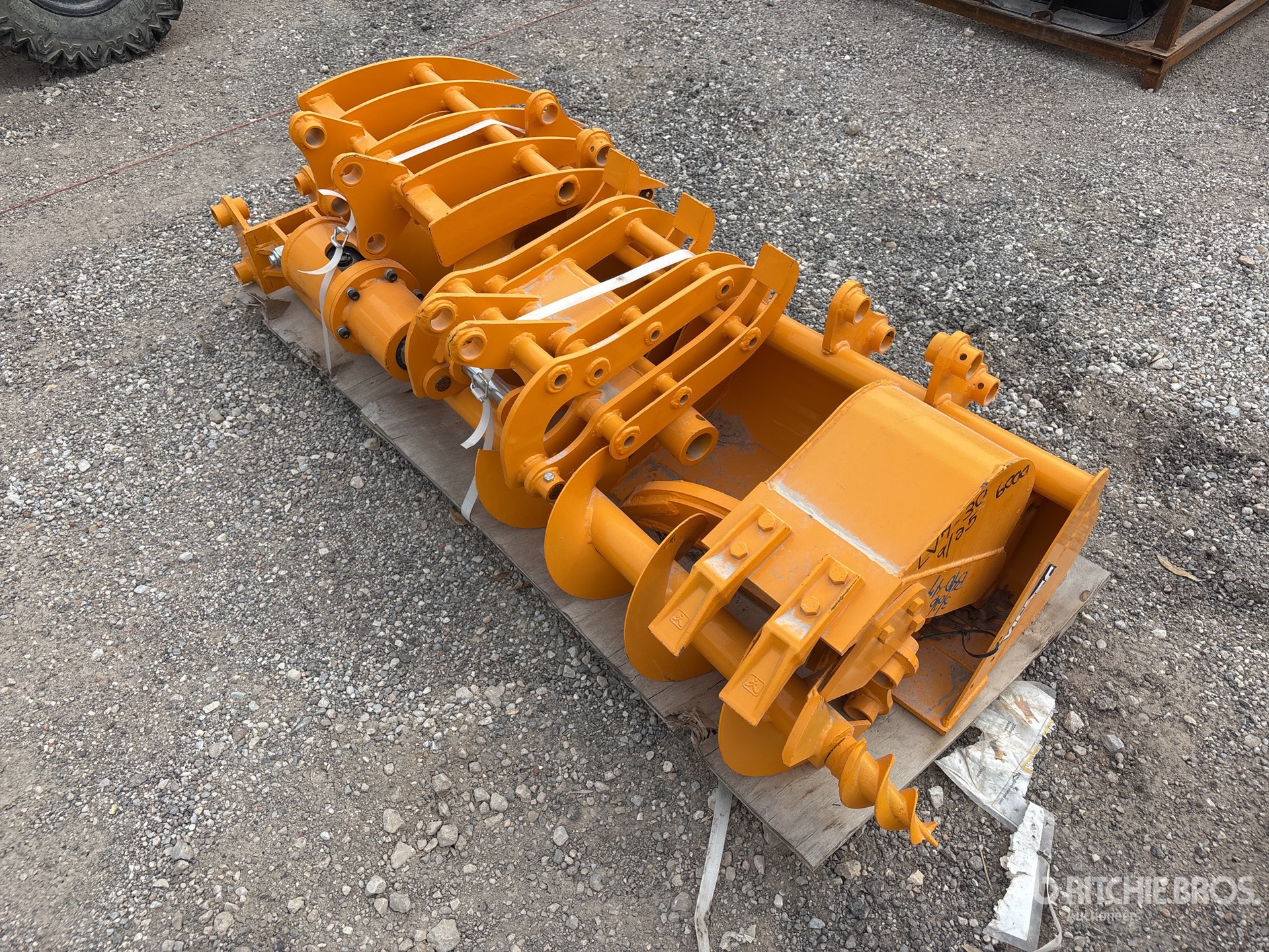 (3) Buckets, (1) Rake, (1) Grapple, (1) Ripper, (1) Auger w/bit, (1) Auger bit, One pallet